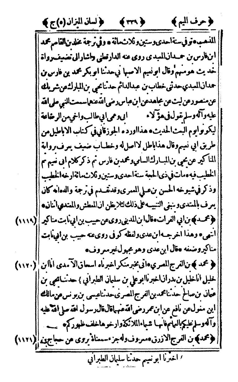 1120 - "محمد" بن الفرج المصري أتى بخبر منكر أخبرناه إسحاق الآمدي أنا بن خليل أنا خليل بن بدران أخبرنا أبو علي بن سليمان الطبراني1 حدثنا يحيى بن عثمان ابن صالح حدثنا محمد بن الفرج المصري حدثنا عيسى بن يونس عن مالك بن مغول عن نافع عن ابن عمر رضى الله عنهما قال: قال رسول الله صلى الله عليه وآله وسلم عليكم بالعمائم فانها سيماء الملائكة وارخوها خلف ظهوركم.