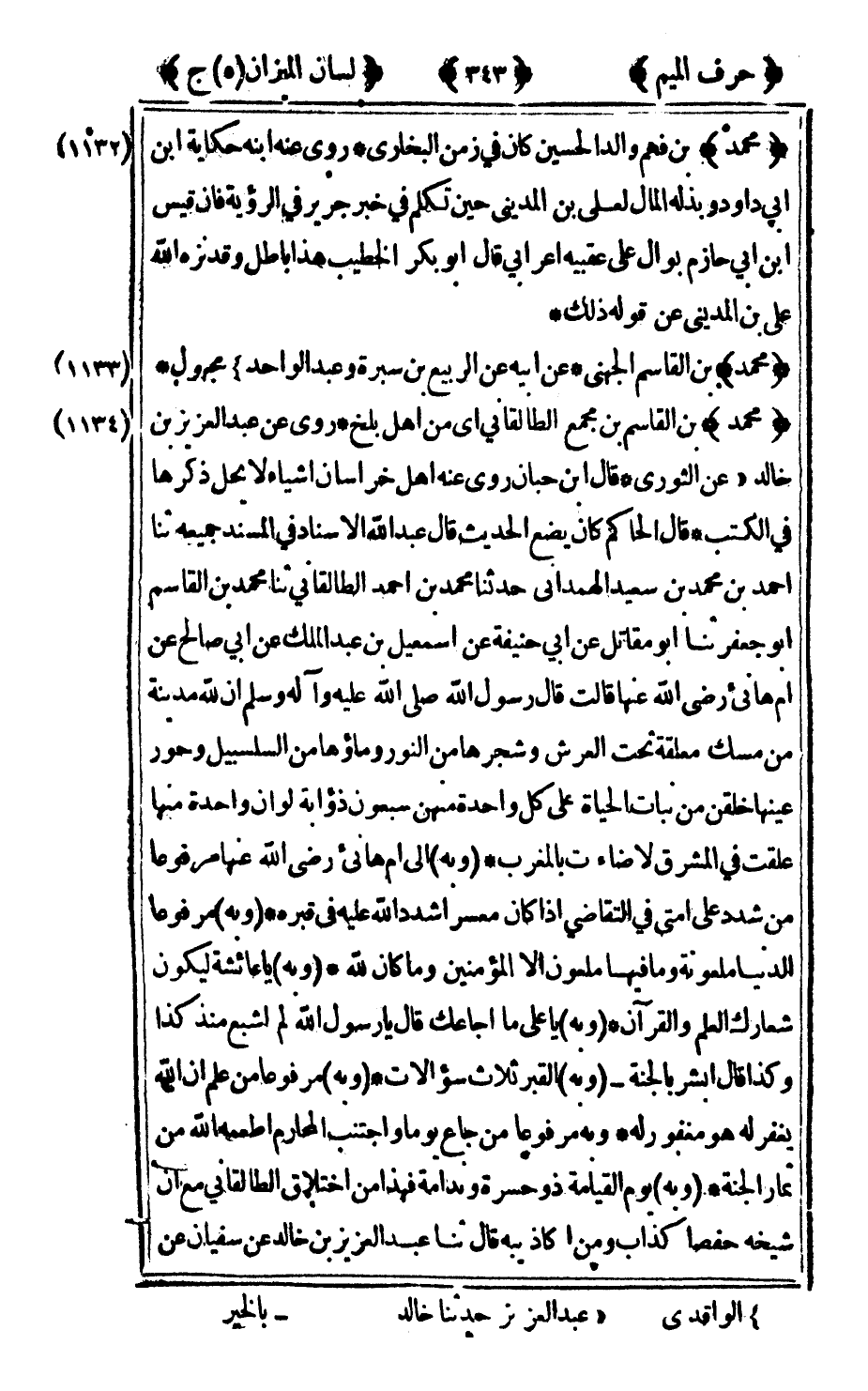 1132 - "محمد" بن فهم والد الحسين كان في زمن البخاري روى عنه ابنه حكاية بن أبي داود وبذله المال لعلي بن المديني حين تكلم في جرير في الرؤية فإن قيس بن أبي حازم بوال على عقبيه أعرابي قال أبو بكر الخطيب هذا باطل وقد نزه الله علي بن المديني عن قوله ذلك.