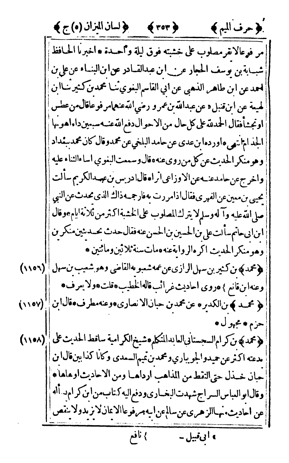 1158 - "محمد" بن كرام السجستاني العابد المتكلم شيخ الكرامية ساقط الحديث على بدعته أكثر عن حميد والجويباري ومحمد بن تميم السعدي وكان كذابين قال ابن حبان خذل حتى التقط من المذاهب ارداها ومن الأحاديث اوهاها وقال أبو العباس السراج شهدت البخاري ودفع إليه كتاب من بن كرام يسأله عن أحاديث منها الزهري عن سالم عن أبيه مرفوعا الإيمان لا يزيد ولا ينقص