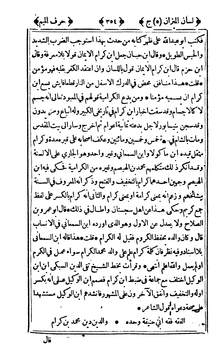 فكتب أبو عبد الله على ظهر كتابه من حدث بهذا استوجب الضرب الشديد والحبس الطويل وقال ابن حبان جعل بن كرام الإيمان قولا بلا معرفة وقال ابن حزم قال ابن كرام الإيمان قول باللسان وإن اعتقد الكفر بقلبه فهو مؤمن قلت: هذا منافق محض في الدرك الأسفل من النار قطعا فايش يسع بن كرام أن يسميه مؤمنا ومن بدع الكرامية قولهم في المعبود تعالى أنه جسم لا كالأجسام وقد سقت أخبار بن كرام في تاريخي الكبير وله أتباع ومريدون وقد سجن بنيسابور لأجل بدعته ثمانية أعوام ثم أخرج وسار إلى بيت المقدس ومات بالشام في سنة خمس وخمسين ومائتين وعكف أصحابه على قبره مدة وكرام مثقل قيده بن ماكولا وابن السمعاني وغير واحد وهو الجاري على الألسنة وقد أنكر ذلك متكلمهم محمد بن الهيصم وغيره من الكرامية فحكى فيه بن الهيصم وجهين أحدهما كرام بالتخفيف والفتح وذكر أنه المعروف في السنة مشائخهم وزعم أنه بمعنى كرامة أبو بمعنى كرام والثاني أنه كرام بالكسر على لفظ جمع كريم وحكى هذا عن أهل سجستان وأطال في ذلك قال أبو عمرو بن الصلاح ولا يعدل عن الأول وهو الذي أورده بن السمعاني في الأنساب قال وكان والده يحفظ الكروم فقيل له الكرام قلت: هذا قاله ابن السمعاني بلا إسناد وفيه نظر فإن كلمة كرام علم على والد محمد الكرام سواء عمل في الكرم أو لم يعمل والله أعلم انتهى وقرأت بخط الشيخ تقي الدين السبكي بن بن الوكيل اختلف مع جماعة في ضبط بن كرام فصمم بن الوكيل على أنه بكسر أوله والتخفيف واتفق الآخرون على المشهور فانشدهم بن الوكيل مستشهدا على صحة دعواه قول الشاعر.