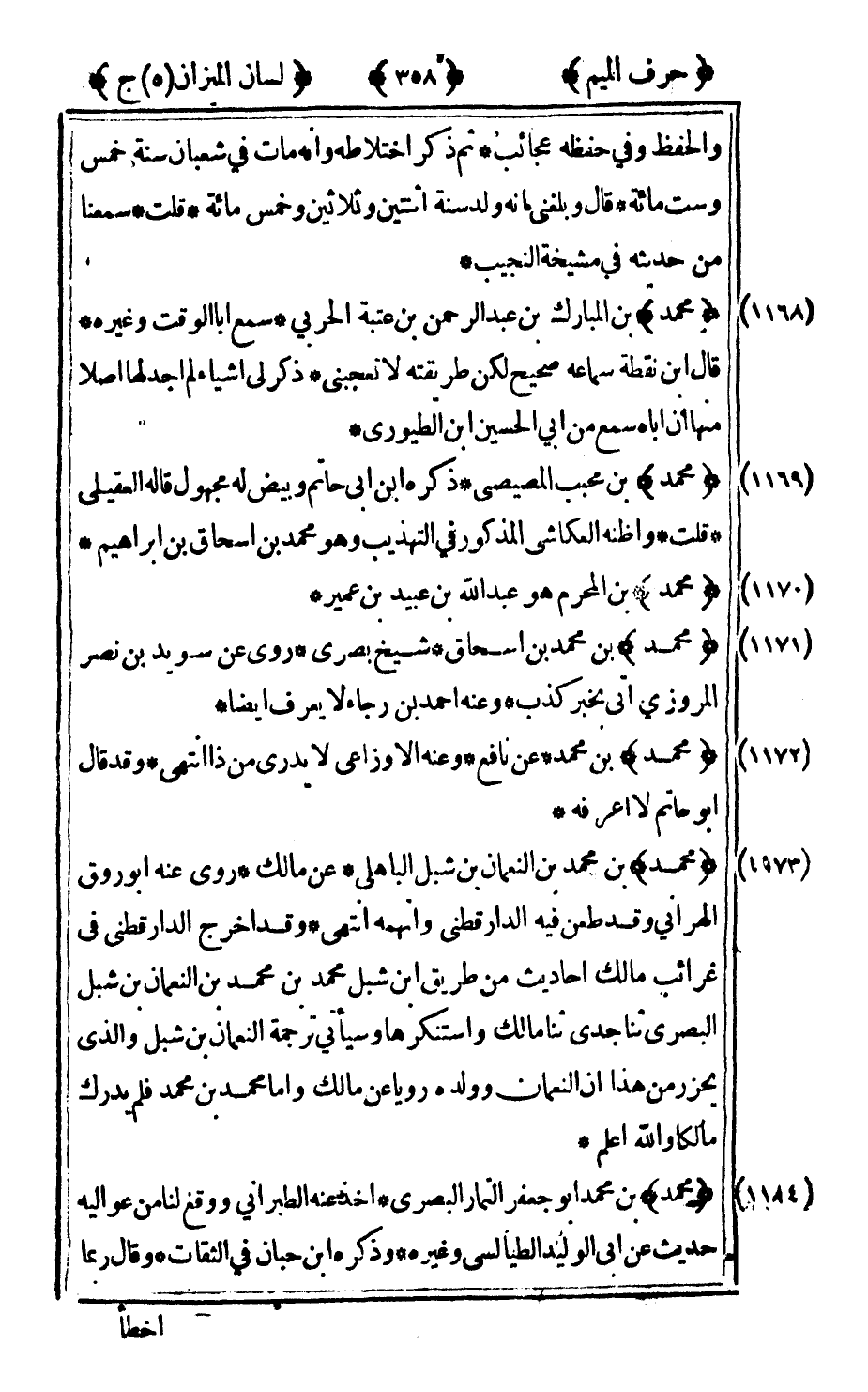 1169 - "محمد" بن محبب المصيصي ذكره ابن أبي حاتم وبيض له مجهول قاله العقيلي قلت: وأظنه العكاشي المذكور في التهذيب وهو محمد بن إسحاق بن إبراهيم.