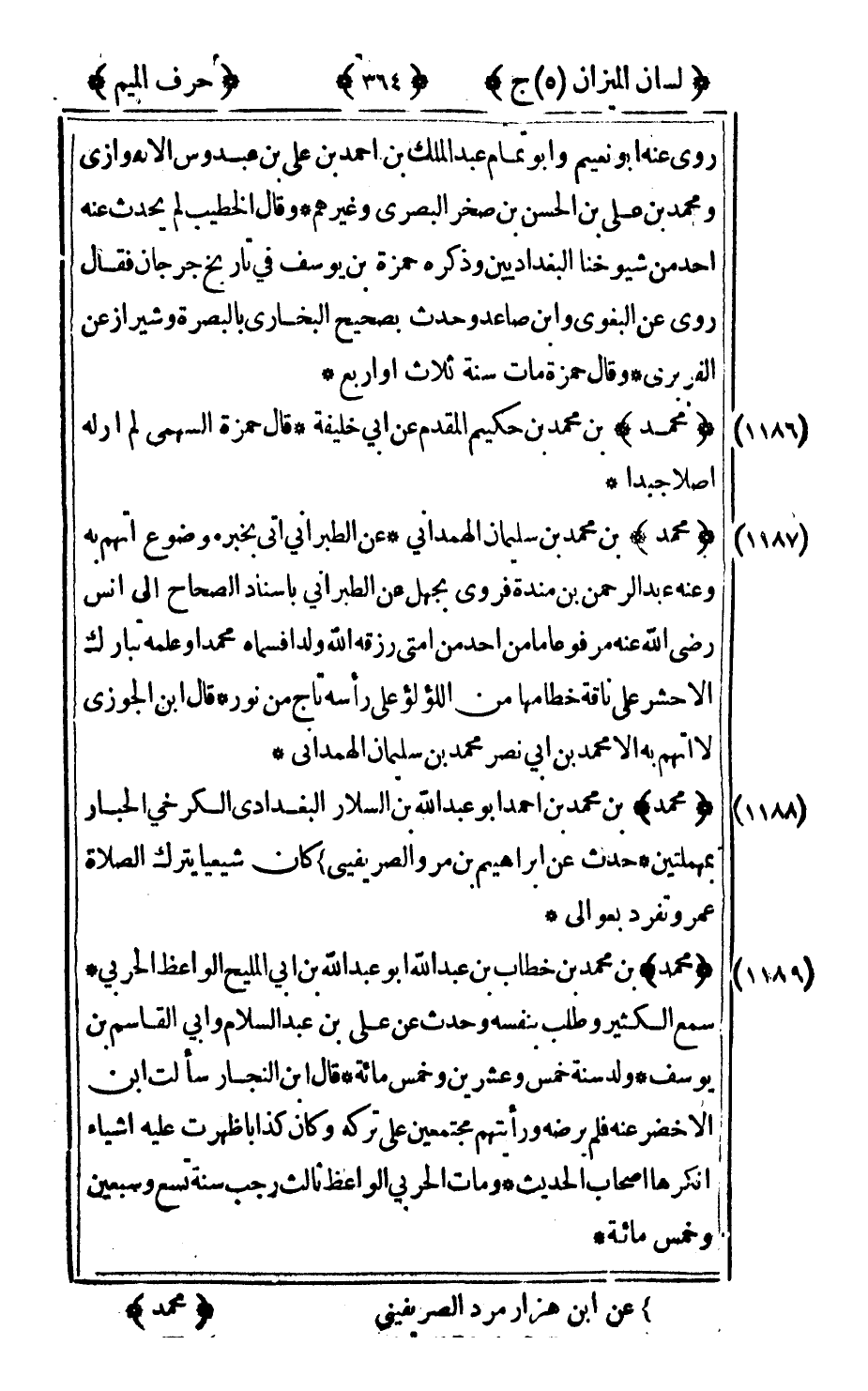 1187 - "محمد" بن محمد بن سليمان الهمداني عن الطبراني أتى بخبره موضوع اتهم به وعنه عبد الرحمن بن مندة: فروى بجهل عن الطبراني بإسناد الصحاح إلى أنس رضى الله عنه مرفوعا ما من أحد من أمتي رزقه الله ولدا فسماه محمدا وعلمه تبارك إلا حشر على ناقة خطامها من اللؤلؤ على رأسه تاج من نور قال ابن الجوزي لا اتهم به إلا محمد بن أبي نصر محمد بن سليمان الهمداني.