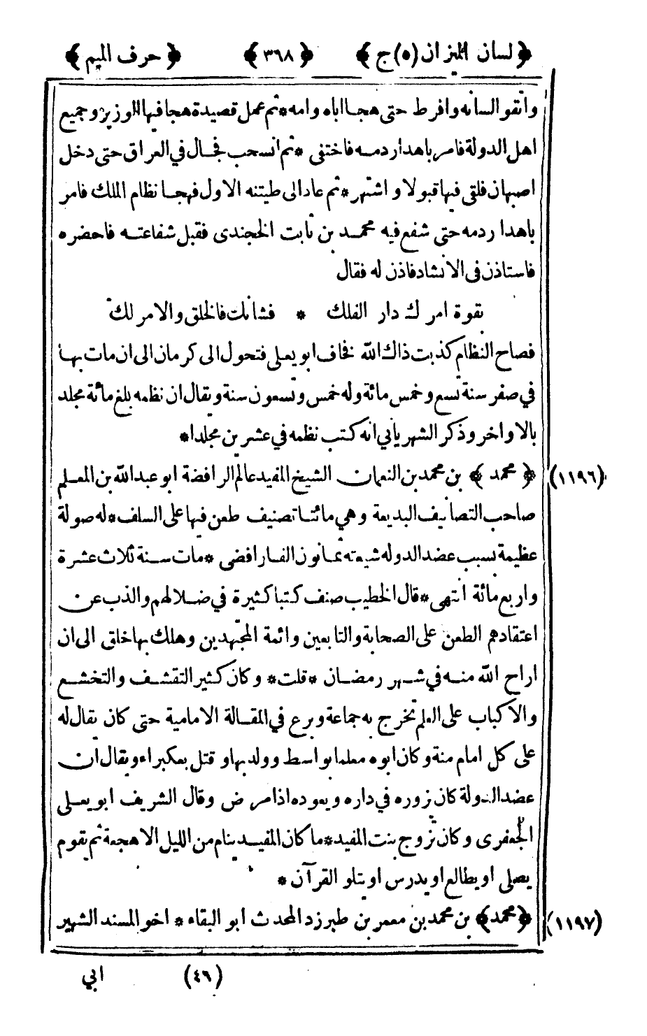 1196 - "محمد" بن محمد بن النعمان الشيخ المفيد عالم الرافضة أبو عبد الله بن المعلم صاحب التصانيف البديعة وهي مائتا تصنيف طعن فيها على السلف له صولة عظيمة بسبب عضد الدولة شيعته ثمانون الفا رافضي مات سنة ثلاث عشرة وأربع مائة انتهى قال الخطيب صنف كتبا كثيرة في ضلالهم والذب عن اعتقادهم الطعن على الصحابة والتابعين وائمة المجتهدين وهلك بها خلق إلى أن اراح الله منه في شهر رمضان قلت: وكان كثير التقشف والتخشع والأكباب على العلم تخرج به جماعة وبرع في المقالة الأمامية حتى كان يقال له على كل امام منة وكان أبوه معلما بواسط وولد بها وقتل بعكبراء ويقال إن عضد الدولة كان يزوره في داره ويعوده إذا مرض وقال الشريف أبو يعلى الجعفري وكان تزوج بنت المفيد ما كان المفيد ينام من الليل إلا هجعة ثم يقوم يصلي أو يطالع أو يدرس أو يتلو القرآن.