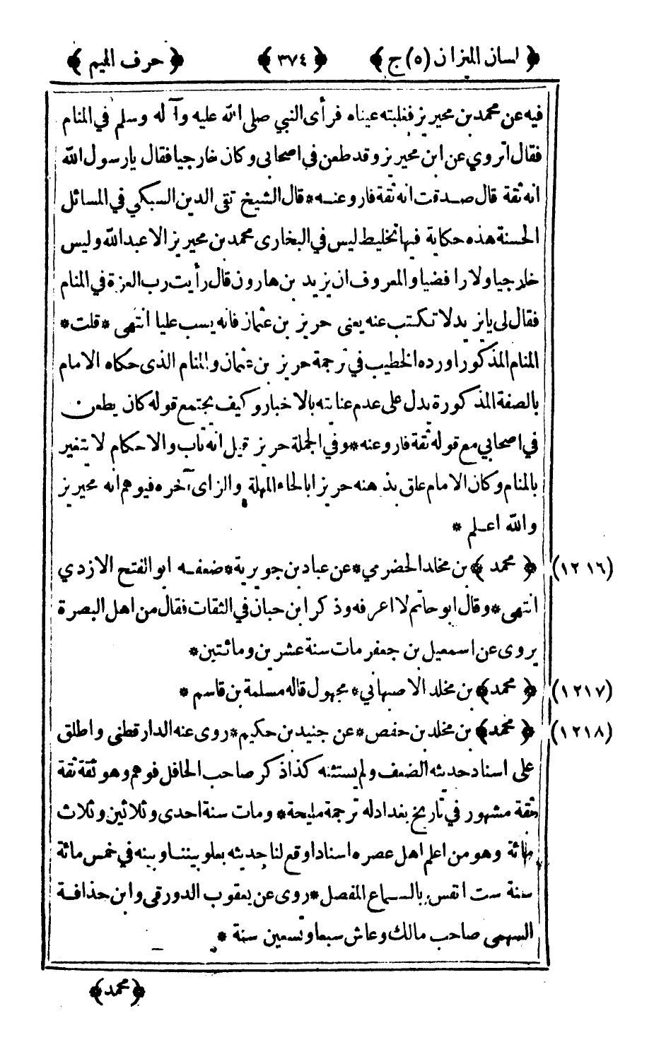 1218 - "محمد" بن مخلد بن حفص عن جنيد بن حكيم روى عنه الدارقطني وأطلق على إسناد حديثه الضعف ولم يستثنه كذا ذكر صاحب الحافل فوهم وهو ثقة ثقة ثقة مشهور في تاريخ بغداد له ترجمة مليحة ومات سنة إحدى وثلاثين وثلاث مائة وهو من أعلم أهل عصره إسنادا وقع لنا حديثه بعلو بيننا وبينه في خمس مائة سنة ست أنفس بالسماع المفصل روى عن يعقوب الدورقي وابن حذافة السهمي صاحب مالك وعاش سبعا وتسعين سنة.
