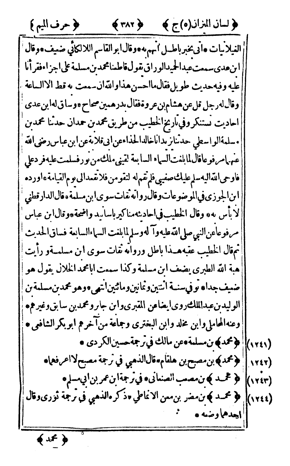 الغيلانيات أتى بخبر باطل اتهم به وقال أبو القاسم اللالكائي ضعيف وقال ابن عدي: سمعت عبد الحميد الوراق يقول: قاطعنا محمد بن مسلمة على أجزاء فقرأنا عليه وفيه حديث طويل فقال: ما أحسن هذا والله إن سمعت به قط إلا الساعة وقال له رجل قل عن هشام بن عروة فقال: بدرهمين صحاح وساق له ابن عدي أحاديث تستنكر وفي تاريخ الخطيب من طريق محمد بن حمدان حدثنا محمد بن مسلمة الواسطي حدثنا يزيد أنا خالد الحذاء عن أبي قلابة عن ابن عباس رضى الله عنهما مرفوعا قال لما بلغت السماء السابعة لقيني ملك من نور فسلمت عليه فرد علي فأوحى الله إليه سلم عليك صفيي فلم تقم له لتقومن فلا تقعد إلى يوم القيامة أورده بن الجوزي في الموضوعات وقال رواته ثقات سوى بن مسلمة قال الدارقطني لا بأس به وقال الخطيب في أحاديثه مناكير بأسانيد واضحة وقال ابن عباس مرفوعا عن النبي صلى الله عليه وآله وسلم لما بلغت السماء السابعة فساق الحديث ثم قال الخطيب عقبه هذا باطل ورواته ثقات سوى بن مسلمة ورأيت هبة الله الطبري يضعف بن مسلمة وكذا سمعت أبا محمد الخلال يقول: هو ضعيف جدا توفي سنة اثنتين وثمانين ومائتين انتهى وهو محمد بن مسلمة بن الوليد بن عبد الملك روى أيضا عن المقبري وابن جابر ومحمد بن سابق وغيرهم وعنه المحاملي وابن مخلد وابن البختري وجماعة من آخرهم أبو بكر الشافعي.