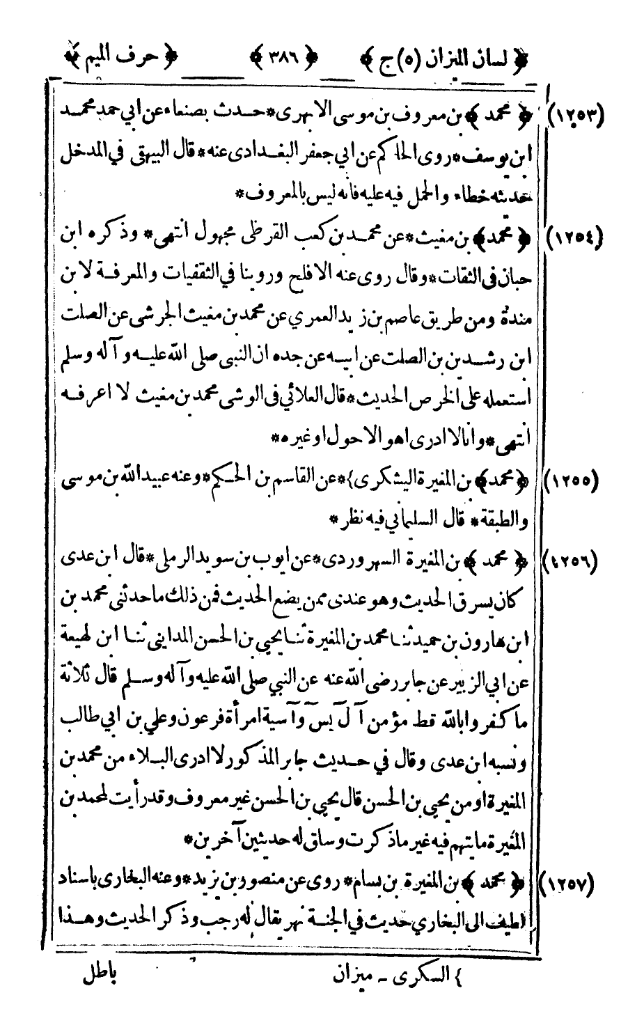 1257 - "محمد" بن المغيرة بن بسام روى عن منصور بن يزيد وعنه البخاري بإسناد لطيف إلى البخاري حديث في الجنة نهر يقال له رجب وذكر الحديث وهذا