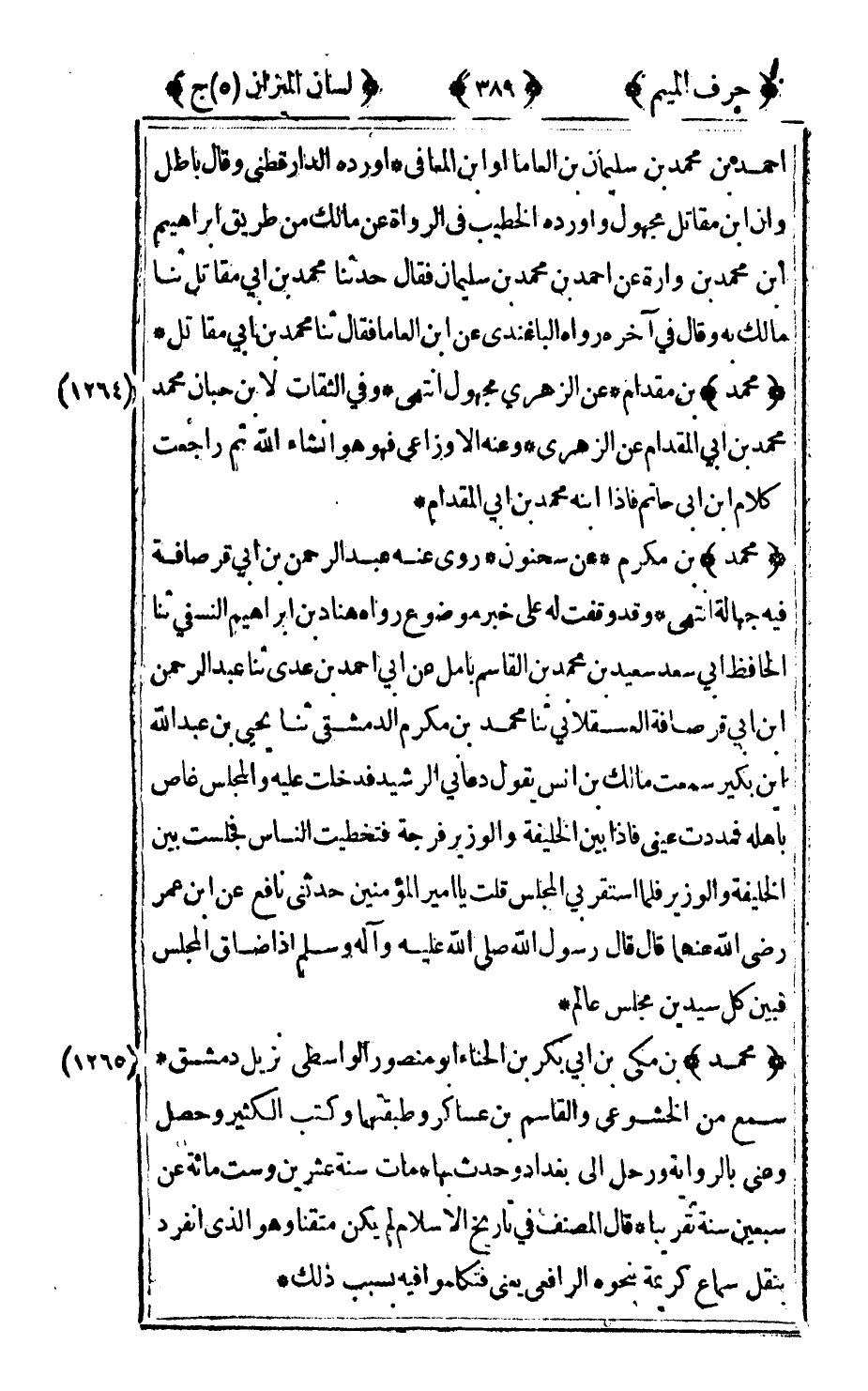 1264 - "محمد" بن مكرم عن سحنون روى عنه عبد الرحمن بن أبي قرصافة فيه جهالة انتهى وقد وقفت له على خبر موضوع رواه هناد بن إبراهيم النسفي ثنا الحافظ أبي سعد سعيد بن محمد بن القاسم بامل من أبي أحمد بن عدي ثنا عبد الرحمن بن أبي قرصافة العسقلاني ثنا محمد بن مكرم الدمشقي ثنا يحيى بن عبد الله بن بكير سمعت مالك بن أنس يقول: دعاني الرشيد فدخلت عليه والمجلس غاص باهله فمددت عيني فإذا بين الخليفة والوزير فرجة فتخطيت الناس فجلست بين الخليفة والوزير فلما استقر بي المجلس قلت: يا أمير المؤمنين حدثني نافع عن ابن عمر رضى الله عنهما قال: قال رسول الله صلى الله عليه وآله وسلم إذا ضاق المجلس فبين كل سيدين مجلس عالم.