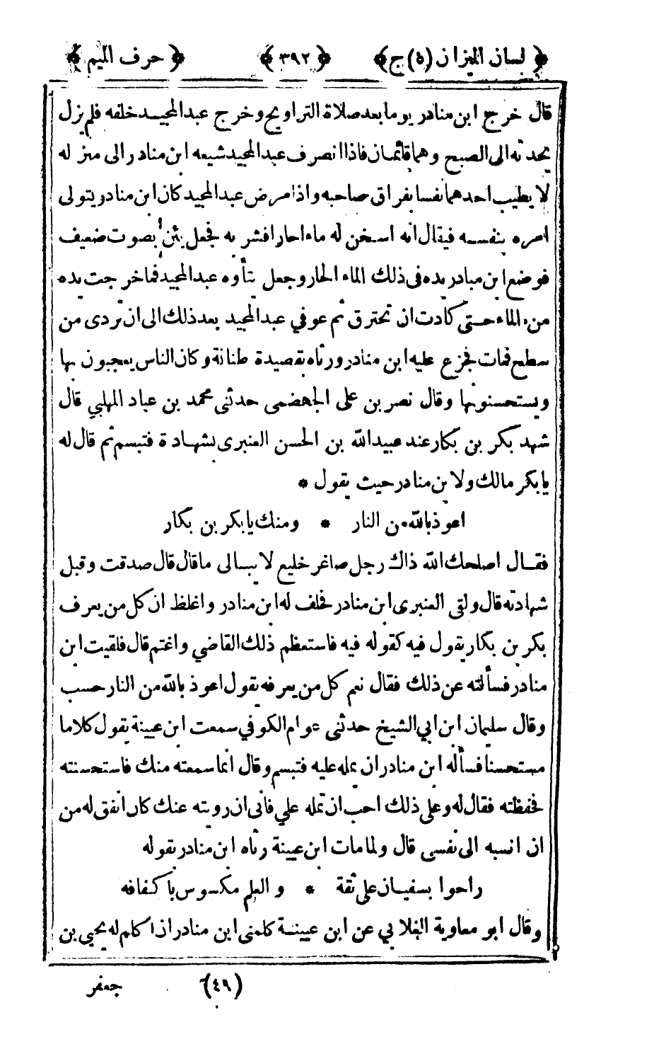 فقال: أصلحك الله ذاك رجل صاغر خليع لا يبالي ما قال: قال صدقت وقبل شهادته قال ولقي العنبري بن منادر فحلف له ابن منادر واغلظ أن كل من يعرف بكر بن بكار يقول: فيه كقوله فيه فاستعظم ذلك القاضي واغتم قال فلقيت بن منادر فسألته عن ذلك فقال: نعم كل من يعرفه يقول: أعوذ بالله من النار حسب وقال سليمان ابن أبي الشيخ حدثني عوام الكوفي سمعت ابن عيينة يقول: كلاما مستحسنا فسأله بن منادر أن يمله عليه فتبسم وقال إنما سمعته منك فاستحسنته فحفظته فقال له: وعلى ذلك أحب أن تمله علي فإني إن رويته عنك كان انفق له من أن انسبه إلى نفسي قال ولما مات بن عيينة رثاه بن منادر بقوله: