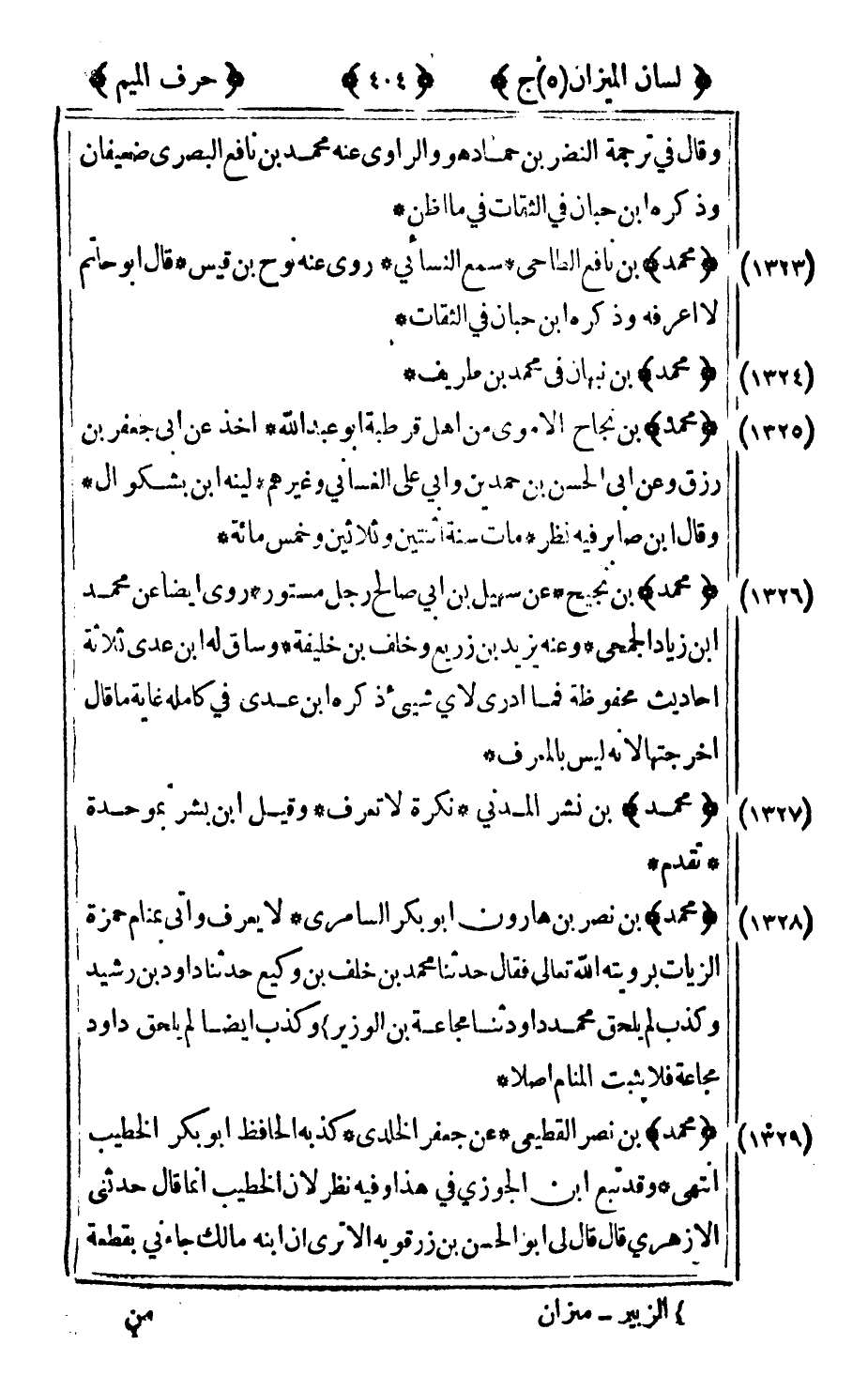 1329 - "محمد" بن نصر القطيعي عن جعفر الخلدي كذبه الحافظ أبو بكر الخطيب انتهى وقد تبع بن الجوزي في هذا وفيه نظر لان الخطيب إنما قال حدثني الأزهري قال: قال لي أبو الحسن بن زرقويه إلا ترى أن ابنه مالك جاءني بقطعة