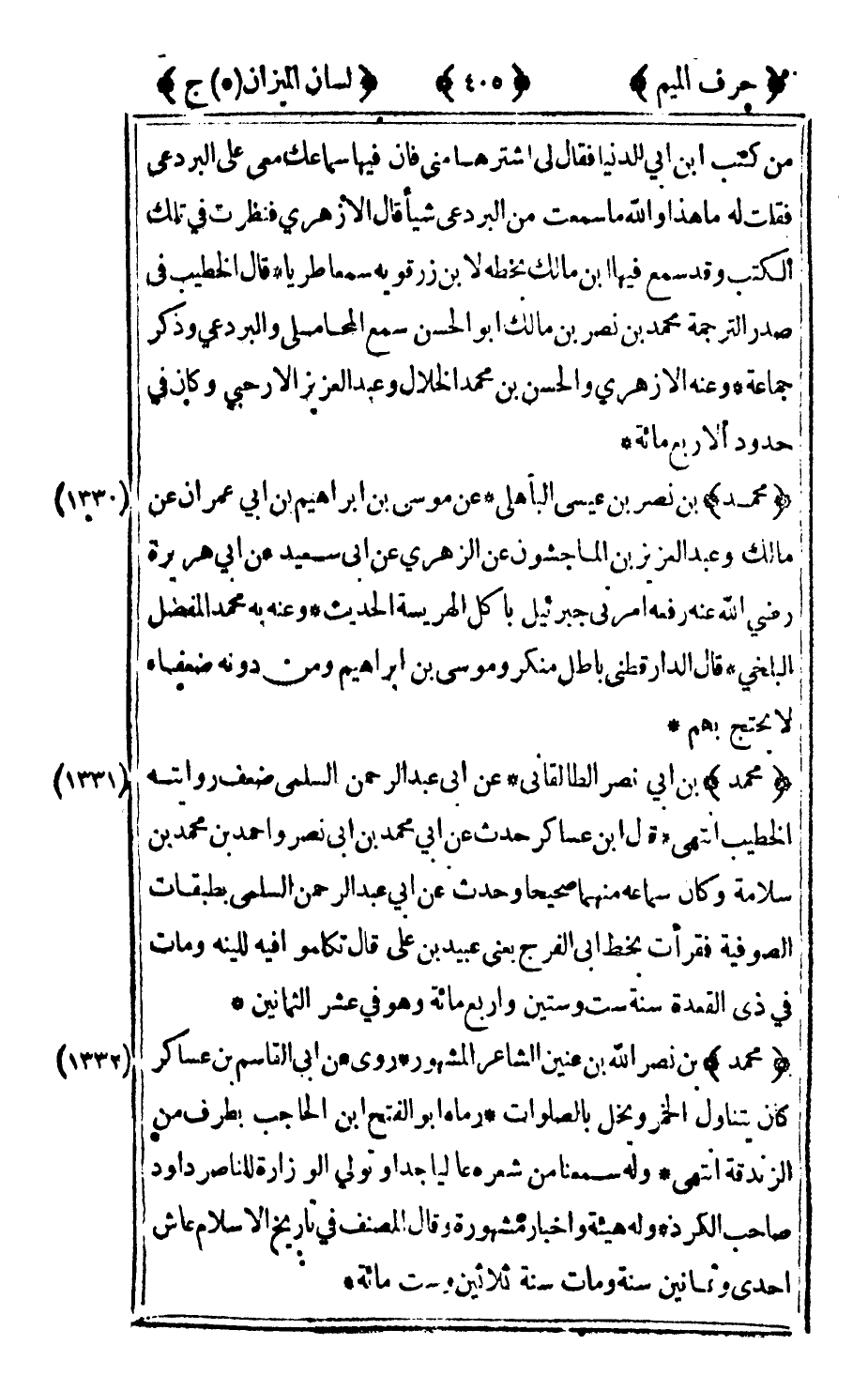 1331 - "محمد" بن أبي نصر الطالقاني عن أبي عبد الرحمن السلمي ضعف روايته الخطيب انتهى قال ابن عساكر حدث عن أبي محمد بن أبي نصر وأحمد بن محمد بن سلامة وكان سماعه منهما صحيحا وحدث عن أبي عبد الرحمن السلمي بطبقات الصوفية فقرأت بخط أبي الفرج يعني عبيد بن علي قال تكلموا فيه للينه ومات في ذي القعدة سنة ست وستين وأربع مائة وهو في عشر الثمانين.