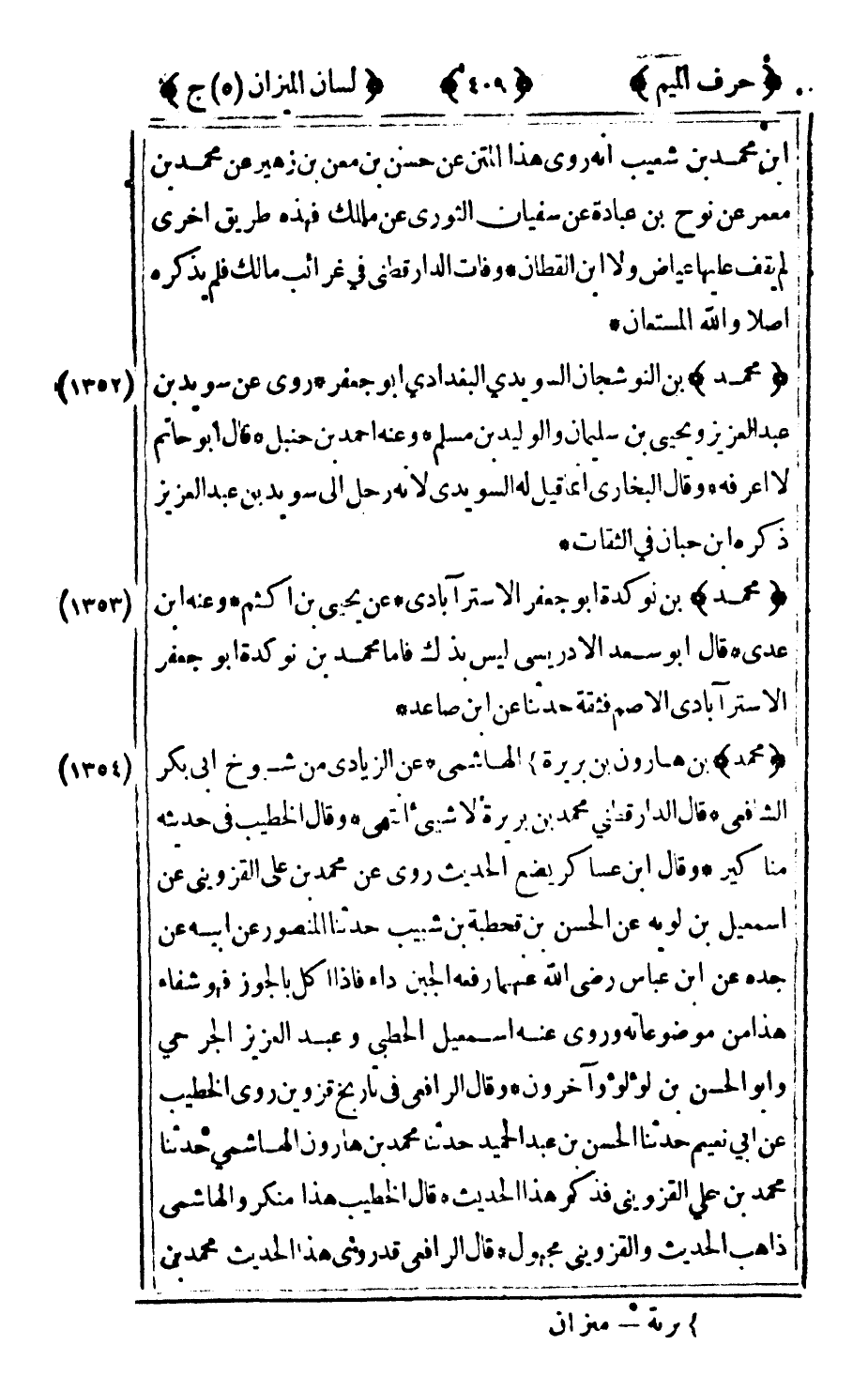 1352 - "محمد" بن النوشجان السويدي البغدادي أبو جعفر روى عن سويد بن عبد العزيز ويحيى بن سليمان والوليد بن مسلم وعنه أحمد بن حنبل قال أبو حاتم لا أعرفه وقال البخاري إنما قيل له السويدي لأنه رحل إلى سويد بن عبد العزيز ذكره ابن حبان في الثقات.