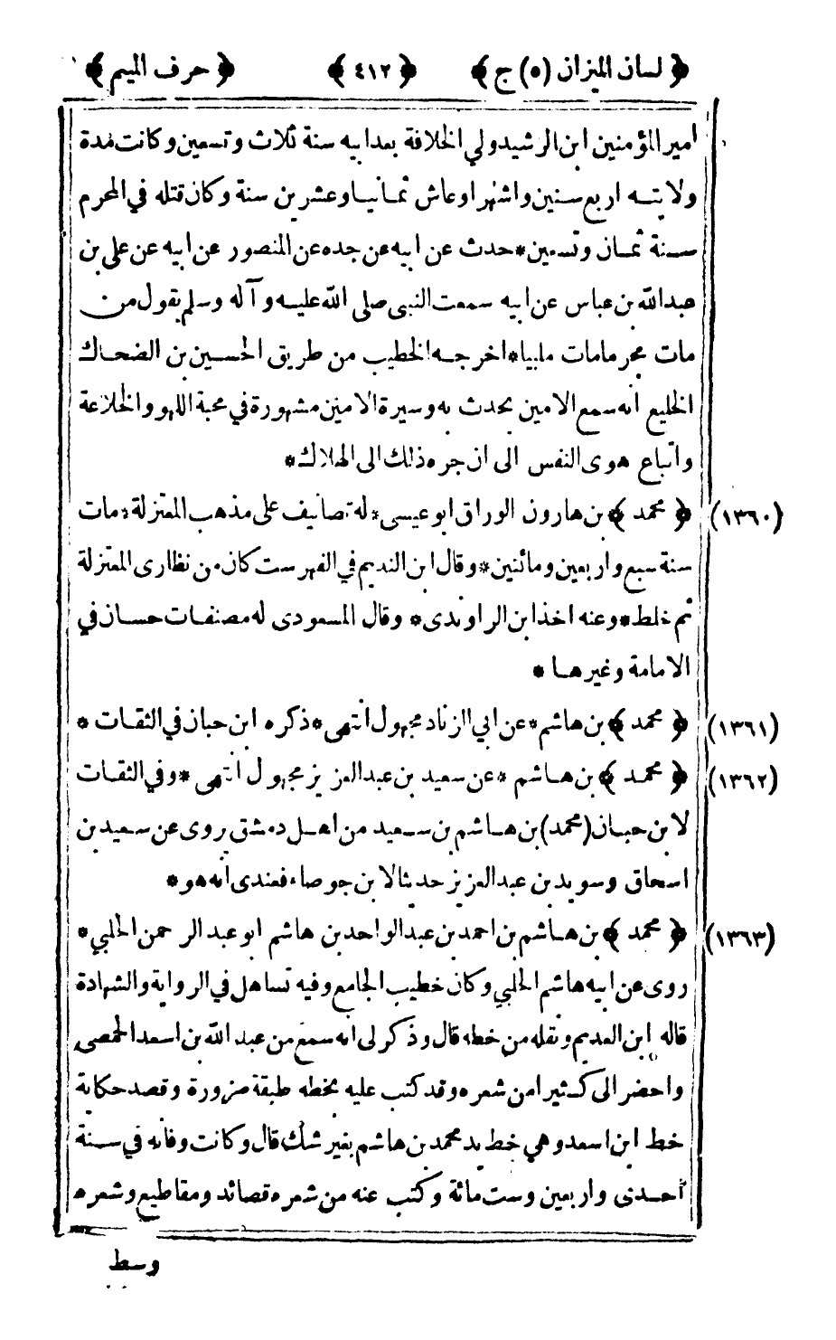 1360 - "محمد" بن هارون الوراق أبو عيسى له تصانيف على مذهب المعتزلة مات سنة سبع وأربعين ومائتين وقال ابن النديم في الفهرست كان من نظارى المعتزلة ثم خلط وعنه أخذ بن الراوندي وقال المسعودي له مصنفات حسان في الإمامة وغيرها.