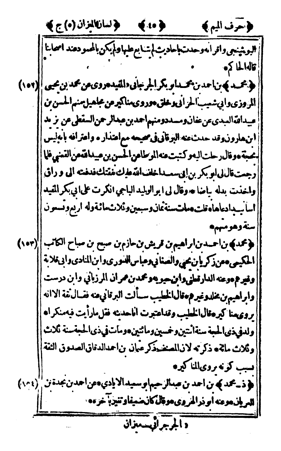 152 - "محمد" بن أحمد بن محمد أبو بكر الجرجاني1 المفيد روى عن محمد بن يحيى المروزي وأبي شعيب الحراني وخلق وروى مناكير عن مجاهيل منعم الحسن بن عبيد الله العبدي عن عفإن ومسدد ومنهم أحمد بن عبد الرحمن السقطي عن يزيد بن هارون وقد حدث عنه البرقاني في صحيحه مع اعتذاره واعترافه بأنه ليس بحجة وقال رحلت إليه وكتبت عنه الموطأ عن الحسن بن عبيد الله عن القعنبي فلما رجعت قال لي أبو بكر بن أبي سعد اخلف الله عليك نفقتك فدفعته إلى وراق وأخذت بدله بياضا وقال لي أبو الوليد الباجي أنكرت على أبي بكر المفيد أسانيد ادعاها قلت: مات سنة ثمان وسبعين وثلاث مائة وله أربع وتسعون سنة وهو متهم.