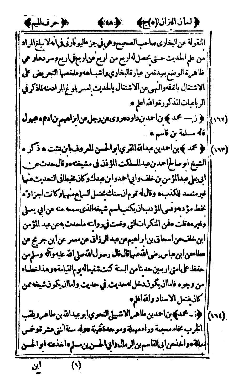 163 - "محمد" بن أحمد بن عبد الله المقرى أبو الحسن المعروف بابن بشت ذكره الشيخ أبو صالح أحمد بن عبد المسلكت المؤذن في مشيخته وقال حدث عن أبي يعلى عبد المؤمن بن خلف وأبي أحمد وابن عبدك وكان مخبطا في التحديث عنهما غير متعمد للكذب وقال له قوم إن سنك يحتمل السماع منهما وكانت اجزاؤه بخط مؤدبه ونسي المؤدب أن يكتب اسم شيخه الذي سمعه منه عن أبي يعلى وغيره قلت: فمن المنكرات التي وقعت في روايته ما حدث به عن عبد المؤمن بن خلف عن إسحاق بن إبراهيم عن عبد الرزاق عن معمر عن ابن جريج عن عطاء عن ابن عباس رضى الله عنهما قال: قال رسول الله صلى الله عليه وآله وسلم من حفظ على أمتي أربعين حديثا من السنة كنت شفيعا له يوم القيامة وهذا خطاء من وجوه فأما أن يكون دخل له حديث في حديث وأما أن يكون شيخه ممن كان يفتعل الإسناد والله أعلم.