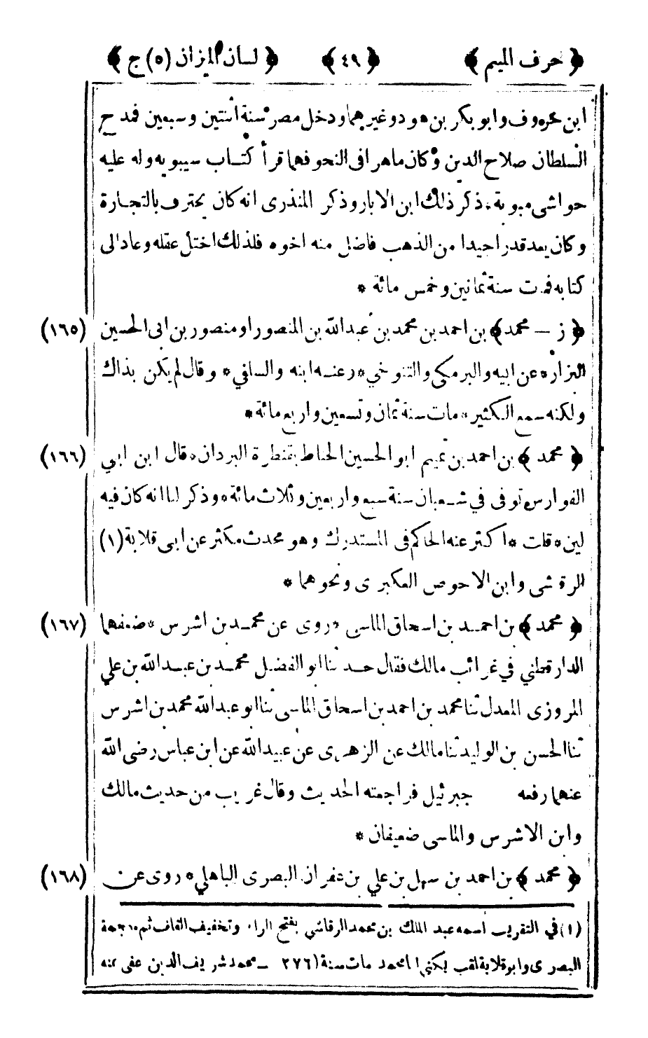 165 - "ز - محمد" بن أحمد بن محمد بن عبد الله بن المنصور أو منصور بن أبي الحسين البزار عن أبيه والبرمكي والتنوخي وعنه ابنه والسلفي وقال لم يكن بذاك ولكنه سمع الكثير مات سنة ثمان وتسعين وأربع مائة.