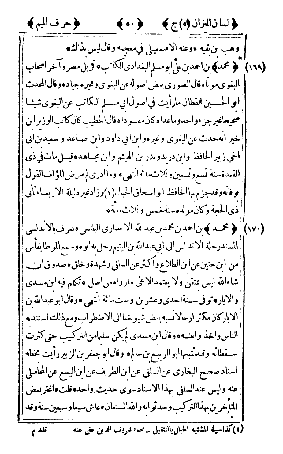 169 - "محمد" بن أحمد بن علي أبو مسلم البغدادي الكاتب نزيل مصر وآخر أصحاب البغوي موتا قال الصوري بعض أصوله عن البغوي وغيره جياد وقال المحدث أبو الحسين القطان ما رأيت في أصول أبي مسلم الكاتب عن البغوي شيئا صحيحا غير جزء واحد وما عداه كان مفسودا قال الخطيب كان كاتب الوزير بن خير أنه حدث عن البغوي وغيره وابن أبي داود وابن صاعد وسعيد بن أبي أخي زبير الحافظ وابن دريد وبدر بن الهيثم وابن مجاهد قيل مات في ذي القعدة سنة تسع وتسعين وثلاث مائة انتهى وما أدري لم مرض المؤلف القول بوفاته وقد جزم بها الحافظ أبو إسحاق الحبال1 وزاد غيره ليلة الأربعاء ثاني ذي الحجة وكان مولده سنة خمس وثلاث مائة.