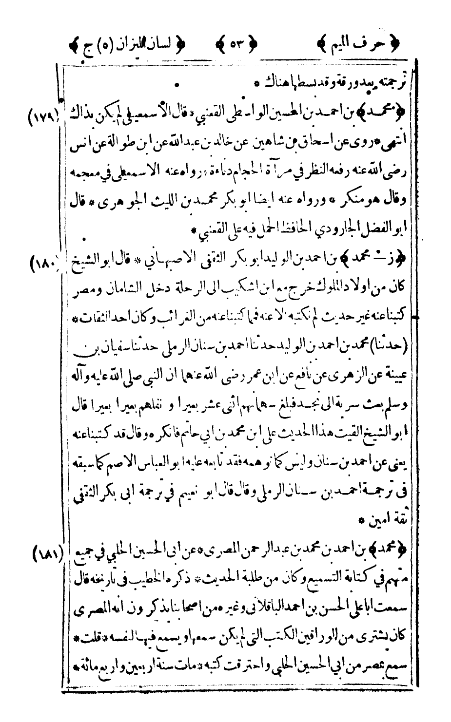 181 - "محمد" بن أحمد بن محمد بن عبد الرحمن المصري عن أبي الحسين الحلبي في جميع متهم في كتابة التسميع وكان من طلبة الحديث ذكره الخطيب في تاريخه قال سمعت أبا علي الحسن بن أحمد الباقلاني وغيره من أصحابنا يذكرون أنه المصري كان يشتري من الوراقين الكتب التي لم يكن سمعها ويسمع فيها لنفسه قلت: سمع بمصر من أبي الحسين الحلبي واحترقت كتبه مات سنة أربعين وأربع مائة.
