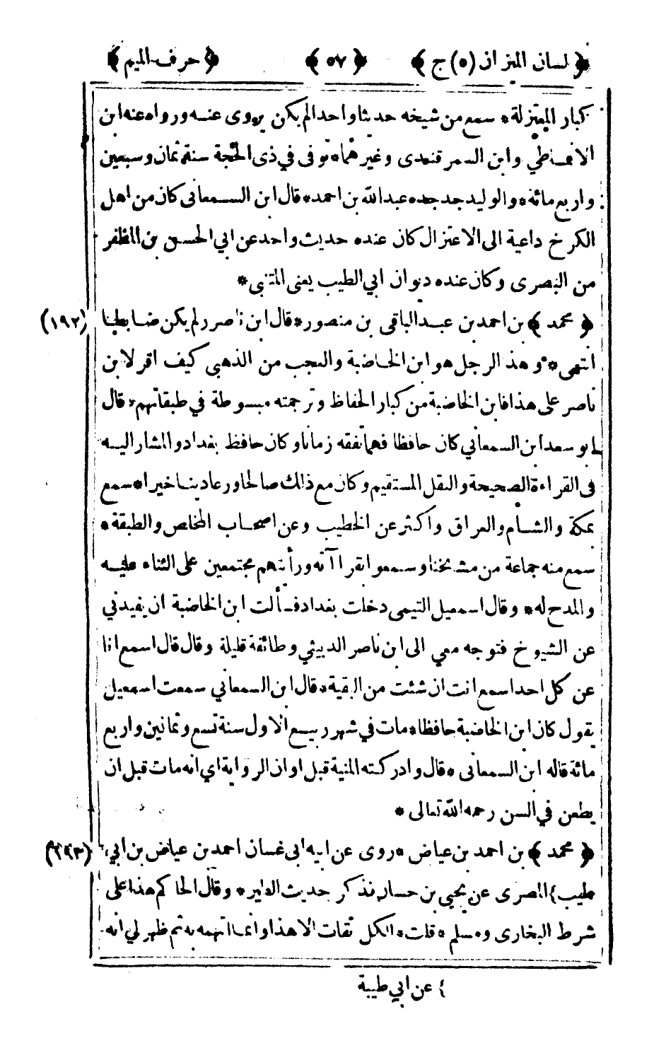 192 - "محمد" بن أحمد بن عبد الباقي بن منصور قال ابن ناصر لم يكن ضابطا انتهى وهذا الرجل هو ابن الخاضبة والعجب من الذهبي كيف أقر لابن ناصر على هذا فابن الخاضبة من كبار الحفاظ وترجمته مبسوطة في طبقاتهم قال أبو سعد بن السمعاني كان حافظا فهما تفقه زمانا وكان حافظ بغداد والمشار إليه في القراءة الصحيحة والنقل المستقيم وكان مع ذلك صالحا ورعا دينا خيرا سمع بمكة والشام والعراق وأكثر عن الخطيب وعن أصحاب المخلص والطبقة سمع منه جماعة من مشايخنا وسمعوا بقراآته ورأيتهم مجتمعين على الثناء عليه والمدح له وقال إسماعيل التيمي دخلت بغداد فسألت بن الخاضبة أن يفيدني عن الشيوخ فتوجه معي إلى بن ناصر الدبيثي وطائفة قليلة وقال: قال اسمع أنا عن كل أحد اسمع أنت إن شئت من البقية قال ابن السمعاني سمعت إسماعيل يقول: كان ابن الخاضبة حافظا مات في شهر ربيع الأول سنة تسع وثمانين وأربع مائة قاله ابن السمعاني قال وادركته المنية قبل أو أن الرواية أي أنه مات قبل أن يطعن في السن رحمه الله تعالى.