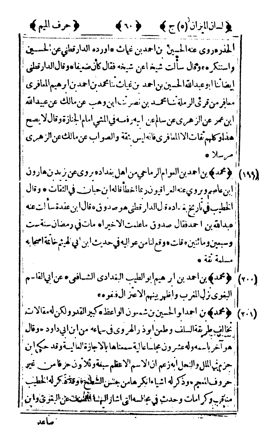 199 - "محمد" بن أحمد بن العوام الرماحي من أهل بغداد يروي عن يزيد بن هارون بن عاصم ويروي عنه العراقيون ربما أخطأ قاله ابن حبان في الثقات وقال الخطيب في تاريخ بغداد قال الدارقطني هو صدوق قال ابن عقدة سألت عنه عبد الله بن أحمد فقال: صدوق ما علمت إلا خيرا مات في رمضان سنة ست وسبعين ومائتين قلت: وقع لنا من عواليه في حديث ابن أبي الهيثم خاتمه اصحابه مسلمة ثقة.
