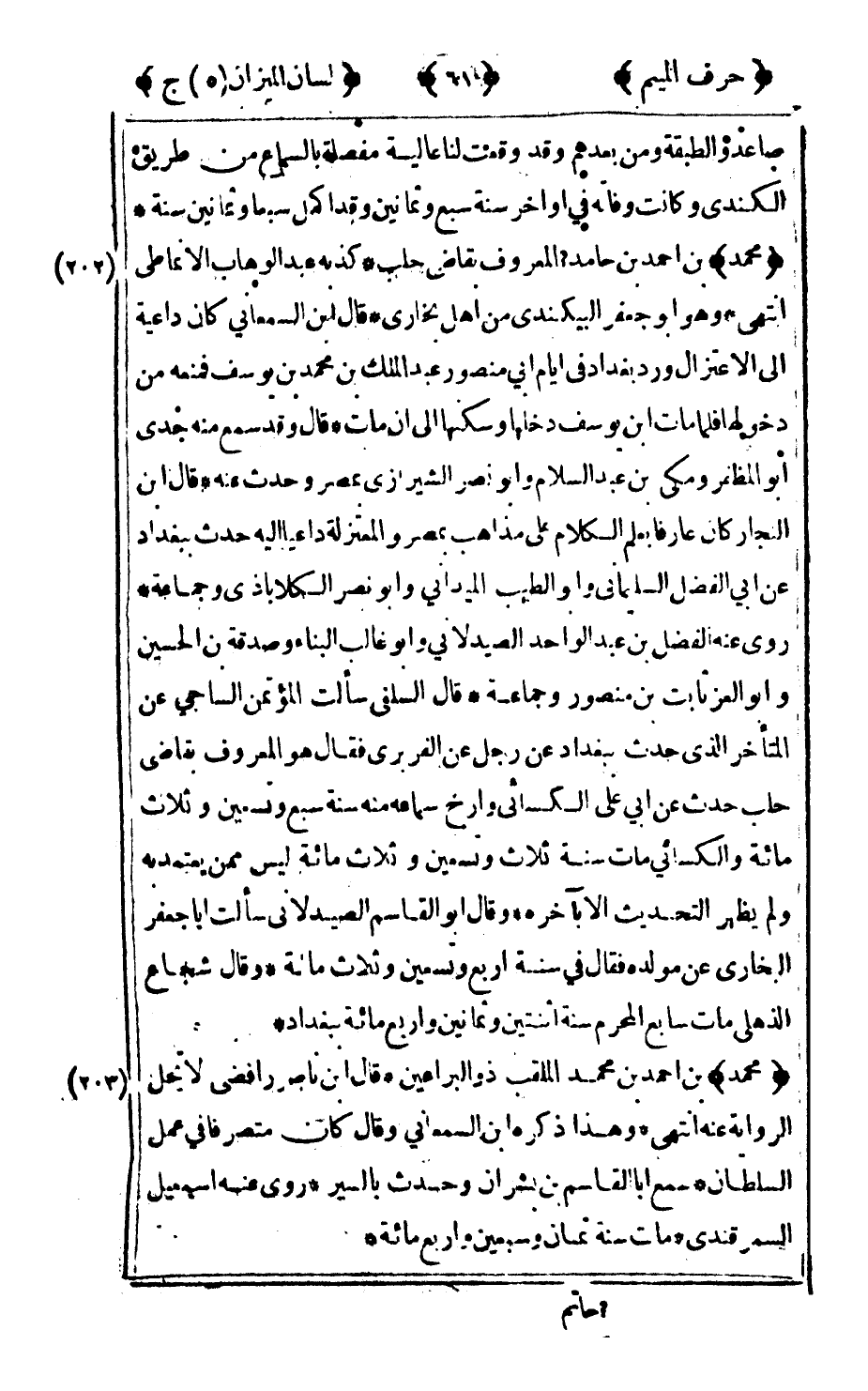 202 - "محمد" بن أحمد بن حامد المعروف بقاضي حلب كذبه عبد الوهاب الأنماطي انتهى وهو أبو جعفر البيكندي من أهل بخارى قال ابن السمعاني كان داعية إلى الاعتزال ورد بغداد في أيام أبي منصور عبد الملك بن محمد بن يوسف فمنعه من دخولها فلما مات بن يوسف دخلها وسكنها إلى أن مات قال وقد سمع منه جدي أبو المظفر ومكي بن عبد السلام وأبو نصر الشيرازي بمصر وحدث عنه قال ابن النجار كان عارفا بعلم الكلام على مذاهب بمصر والمعتزلة داعيا إليه حدث ببغداد عن أبي الفضل السليماني وأبو الطيب الميداني وأبو نصر الكلاباذي وجماعة روى عنه الفضل بن عبد الواحد الصيدلاني وأبو غالب البناء وصدقة بن الحسين وأبو العز ثابت بن منصور وجماعة قال السلفي سألت المؤتمن الساجي عن المتأخر الذي حدث ببغداد عن رجل عن الفربري فقال: هو المعروف بقاضي حلب حدث عن أبي علي الكسائي وأرخ سماعه منه سنة سبع وتسعين وثلاث مائة والكسائي مات سنة ثلاث وتسعين وثلاث مائة ليس ممن يعتمد به ولم يظهر التحديث إلا بآخره وقال أبو القاسم الصيدلاني سألت أبا جعفر البخاري عن مولده فقال: في سنة أربع وتسعين وثلاث مائة وقال شجاع الذهلي مات سابع المحرم سنة اثنتين وثمانين وأربع مائة ببغداد.