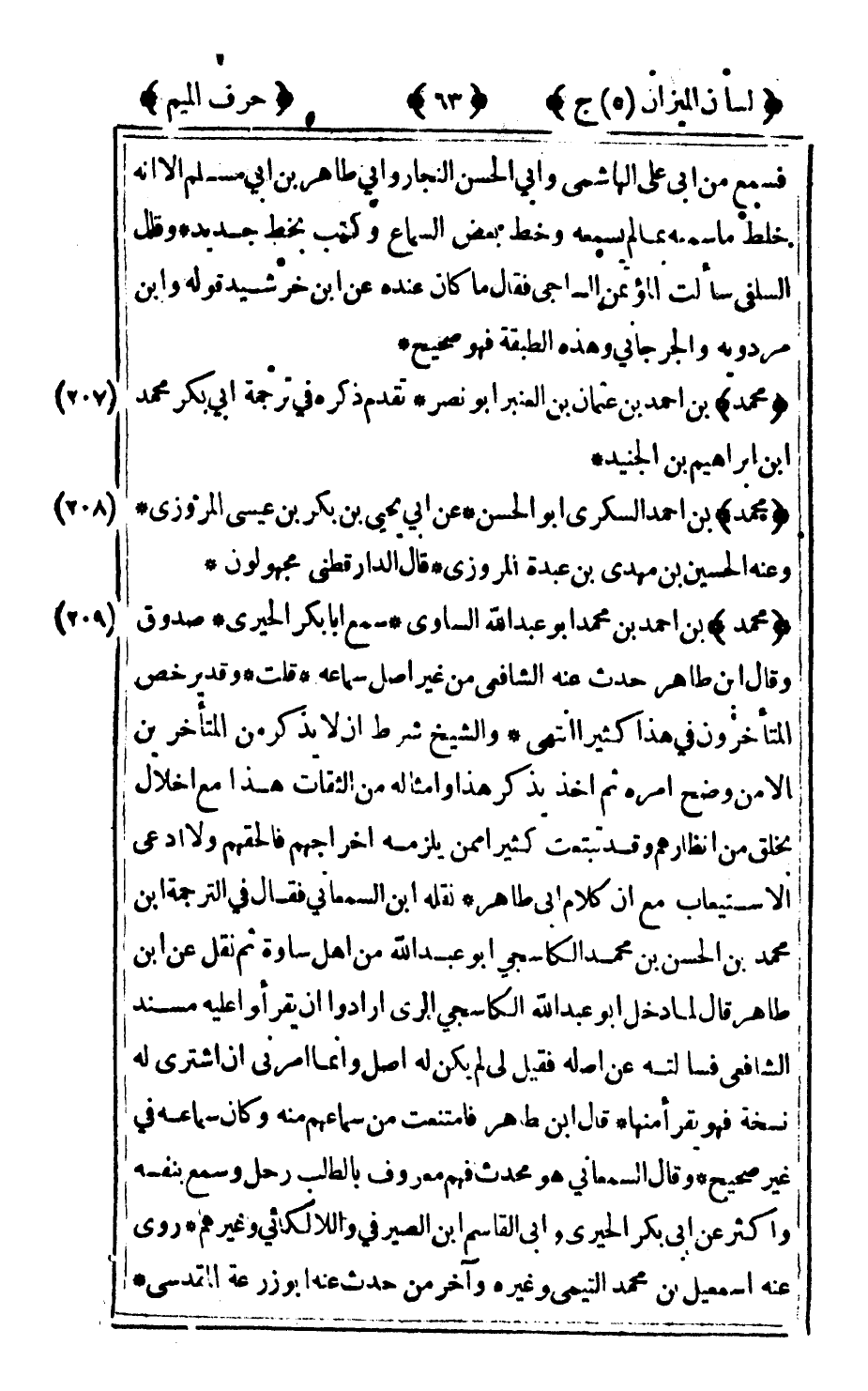 209 - "محمد" بن أحمد بن محمد أبو عبد الله الساوي سمع أبا بكر الحيري صدوق وقال ابن طاهر حدث عنه الشافعي من غير أصل سماعه قلت: وقد يرخص المتأخرون في هذا كثير انتهى والشيخ شرط أن لا يذكر من المتأخرين إلا من وضح امره ثم أخذ يذكر هذا وأمثاله من الثقات هذا مع اخلال بخلق من انظارهم وقد تتبعت كثيرا ممن يلزمه اخراجهم فالحقهم ولا ادعى الاستيعاب مع أن كلام أبي طاهر نقله بن السمعاني فقال في الترجمة بن محمد بن الحسن بن محمد الكاسجي أبو عبد الله من أهل ساوة ثم نقل عن ابن طاهر قال لما دخل أبو عبد الله الكاسجي الري أرادوا أن يقرأوا عليه مسند الشافعي فسألته عن أصله فقيل لي لم يكن له أصل وإنما أمرني أن اشتري له نسخة فهو يقرأ منها قال ابن طاهر فامتنعت من سماعهم منه وكان سماعه في غير صحيح وقال السمعاني هو محدث فهم معروف بالطلب رحل وسمع بنفسه وأكثر عن أبي بكر الحيري وأبي القاسم بن الصيرفي واللالكائي وغيرهم روى عنه إسماعيل بن محمد التيمي وغيره وآخر من حدث عنه أبو زرعة المقدسي
