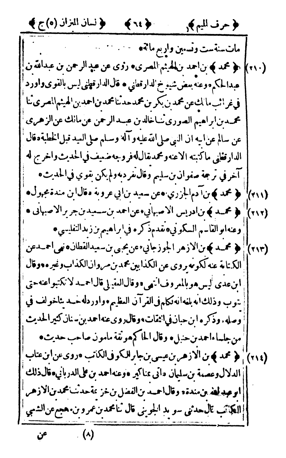 210 - "محمد" بن أحمد بن الهيثم المصري روى عن عبد الرحمن بن عبد الله بن عبد الحكم وعنه بعض شيوخ الدارقطني قال الدارقطني ليس بالقوي واورد في غرائب مالك عن محمد بن بكر بن محمد حدثنا محمد بن أحمد بن الهيثم المصري ثنا محمد بن إبراهيم الصوري ثنا خالد بن عبد الرحمن عن مالك عن الزهري عن سالم عن أبيه أن النبي صلى الله عليه وآله وسلم صلى العيد قبل الخطبة قال الدارقطني ما كتبته إلا عنه ومحمد يقال له فروجه ضعيف في الحديث واخرج له آخر في ترجمة صفو أن ابن سليم وقال تفرد به ولم يكن بقوي في الحديث.