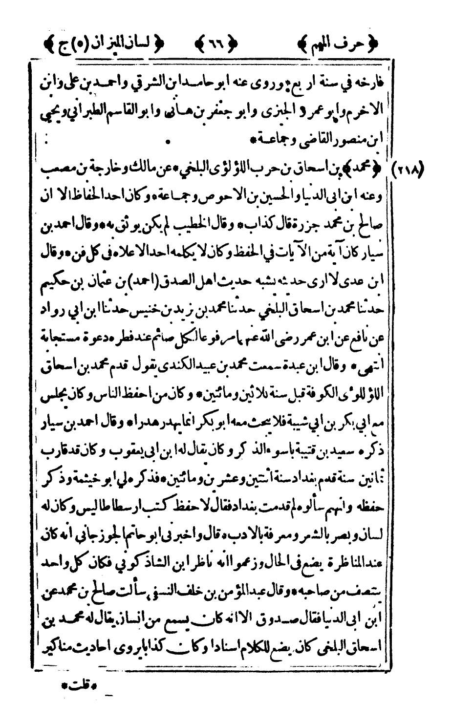 218 - "محمد" بن إسحاق بن حرب اللؤلؤي البلخي عن مالك وخارجة بن مصعب وعنه ابن أبي الدنيا والحسين بن الأحوص وجماعة وكان أحد الحفاظ إلا أن صالح بن محمد جزرة قال كذاب وقال الخطيب لم يكن يوثق به وقال أحمد بن سيار كان آية من الآيات في الحفظ وكان لا يكلمه أحد إلا علاه في كل فن وقال ابن عدي: لا أرى حديثه يشبه حديث أهل الصدق أحمد بن عثمان ابن حكيم حدثنا محمد بن إسحاق البلخي حدثنا محمد بن يزيد بن خنيس حدثنا بن أبي رواد عن نافع عن ابن عمر رضى الله عنهما مرفوعا لكل صائم عند فطره دعوة مستجابة انتهى وقال ابن عبدة سمعت محمد بن عبيد الكندي يقول: قدم محمد بن إسحاق اللؤلؤي الكوفة قبل سنة ثلاثين ومائتين وكان من احفظ الناس وكان يجلس مع أبي بكر بن أبي شيبة فلا يبحث معه أبو بكر إنما يهدر هدرا وقال أحمد بن سيار ذكره سعيد بن قتيبة بأسوء الذكر وكان يقال له ابن أبي يعقوب وكان قد قارب ثمانين سنة قدم بغداد سنة اثنتين وعشرين ومائتين فذكره لي أبو خيثمة وذكر حفظه وانهم سألوه لم قدمت بغداد فقال: لاحفظ كتب ارسطاطاليس وكان له لسان وبصر بالشعر ومعرفة بالأدب قال وأخبرني أبو حاتم الجوزجاني أنه كان عند المناظرة يضع في الحال وزعموا أنه ناظر بن الشاذكوني فكان كل واحد ينتصف من صاحبه وقال عبد المؤمن بن خلف النسفي سألت صالح بن محمد عن ابن أبي الدنيا فقال: صدوق إلا أنه كان يسمع من انسان يقال له محمد بن إسحاق البلخي كان يضع للكلام إسنادا وكان كذابا يروي أحاديث مناكير