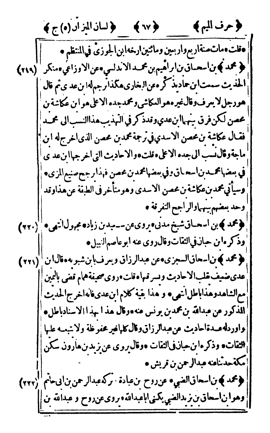 219 - "محمد" بن إسحاق بن إبراهيم بن محمد الأندلسي عن الأوزاعي منكر الحديث سمعت ابن حماد يذكره عن البخاري هكذا ترجم له ابن عدي ثم قال هو رجل لا يعرف وقال غيره هو العكاشي ومحمد جده الأعلى هو ابن عكاشة بن محصن لكن فرق بينهما بن عدي وقد ذكر في التهذيب هذا النسب إلى محمد فقال: عكاشة بن محصن الأسدي في ترجمة محمد بن محصن الذي اخرج له ابن ماجة وقال نسب إلى جده الأعلى قلت: والأحاديث التي أخرجها بن عدي في بعضها محمد بن إسحاق وفي بعضها محمد بن محصن فهذا يرجح صنيع المزي وسيأتي محمد بن عكاشة بن محصن الأسدي وهو متأخر في الطبقة عن هذا وقد وحد بعضهم بينهما والراجح التفرقة.