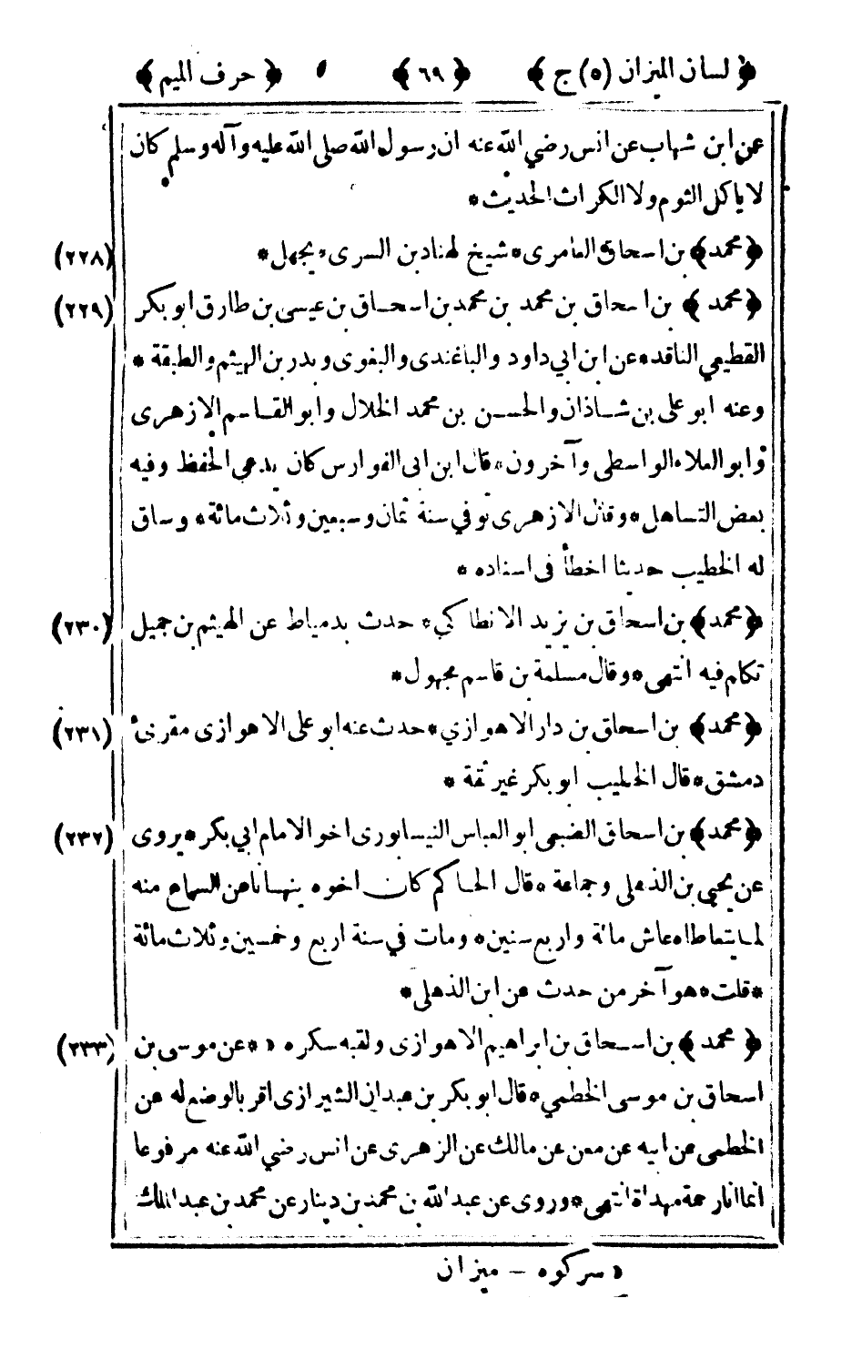 231 - "محمد" بن إسحاق بن دار الأهوازي حدث عنه أبو علي الأهوازي مقرئ دمشق قال الخطيب أبو بكر غير ثقة.