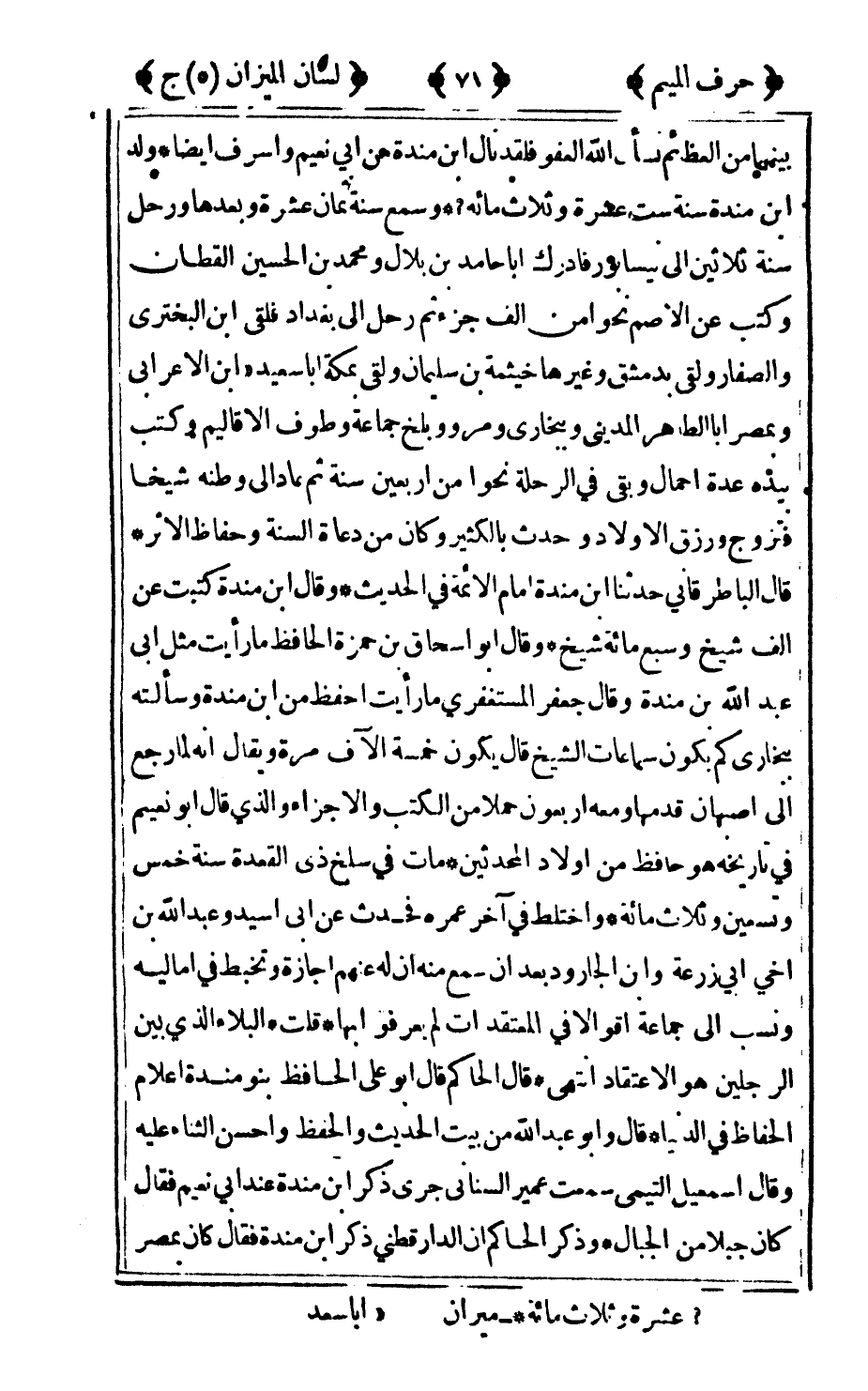 بينهما من العظائم نسأل الله العفو فلقد نال بن مندة من أبي نعيم واسرف أيضا ولد بن مندة سنة ست عشرة وثلاث مائة وسمع سنة ثمان عشرة وبعدها ورحل سنة ثلاثين إلى نيسابور فأدرك أبا حامد بن بلال ومحمد بن الحسين القطان وكتب عن الأصم نحوا من ألف جزء ثم رحل إلى بغداد فلقي بن البختري والصفار ولقي بدمشق وغيرها خيثمة بن سليمان ولقي بمكة أبا سعيد1 بن الأعرابي وبمصر أبا الطاهر المديني وببخارى ومرو وبلخ جماعة وطوف الأقاليم وكتب بيده عدة احمال وبقي في الرحلة نحوا من أربعين سنة ثم عاد إلى وطنه شيخا فتزوج ورزق الأولاد وحدث بالكثير وكان من دعاة السنة وحفاظ الأثر قال الباطرقاني حدثنا بن مندة إمام الأئمة في الحديث وقال ابن مندة: كتبت عن ألف شيخ وسبع مائة شيخ وقال أبو إسحاق بن حمزة الحافظ ما رأيت مثل أبي عبد الله بن مندة وقال جعفر المستغفري ما رأيت احفظ من بن مندة: وسألته ببخارى كم يكون سماعات الشيخ قال يكون خمسة آلالف مرة ويقال إنه لما رجع إلى أصبهان قدمها ومعه أربعون حملا من الكتب والأجزاء والذي قال أبو نعيم في تاريخه هو حافظ من أولاد المحدثين مات في سلخ ذي القعدة سنة خمس وتسعين وثلاث مائة2 واختلط في آخر عمره فحدث عن أبي اسيد وعبد الله بن أخي أبي زرعة وابن الجارود بعد أن سمع منه أن له عنهم إجازة وتخبط في أماليه ونسب إلى جماعة أقوالا في المعتقدات لم يعرفوا بها قلت: البلاء الذي بين الرجلين هو الاعتقاد انتهى قال الحاكم قال أبو علي الحافظ بنو مندة اعلام الحفاظ في الدنيا قال وأبو عبد الله من بيت الحديث والحفظ وأحسن الثناء عليه وقال إسماعيل التيمي سمعت عمير السناني جرى ذكر بن مندة عند أبي نعيم فقال: كان جبلا من الجبال وذكر الحاكم أن الدارقطني ذكر بن مندة فقال: كان بمصر