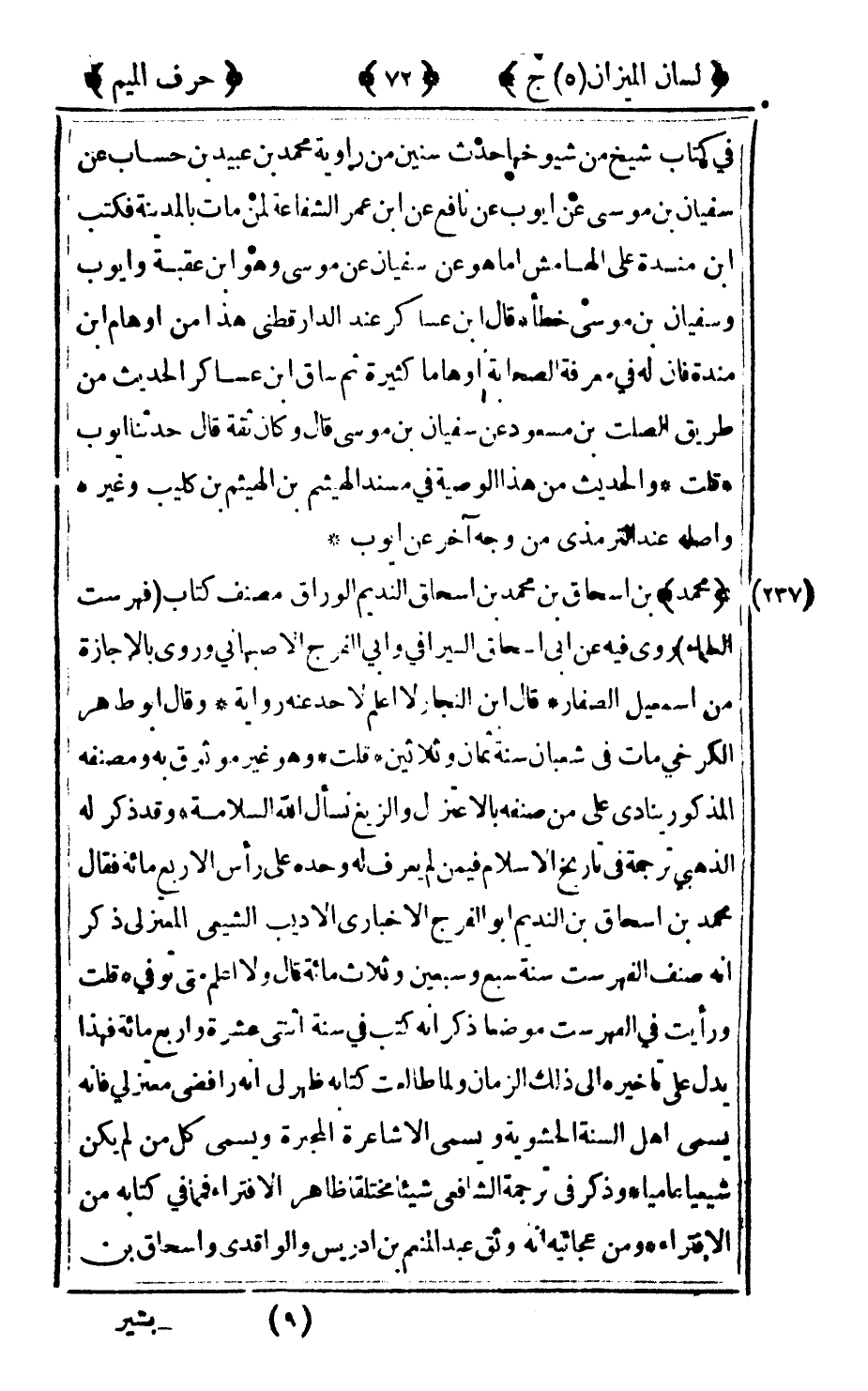 237 - "محمد" بن إسحاق بن محمد بن إسحاق النديم الوراق مصنف كتاب فهرست العلماء روى فيه عن أبي إسحاق السيرافي وأبي الفرج الأصبهاني وروى بالإجازة من إسماعيل الصفار قال ابن النجار لا أعلم لاحد عنه رواية وقال أبو طاهر الكرخي مات في شعبان سنة ثمان وثلاثين قلت: وهو غير موثوق به ومصنفه المذكور ينادي على من صنفه بالإعتزال والزيغ نسأل الله السلامة وقد ذكر له الذهبي ترجمة في تاريخ الإسلام فيمن لم يعرف له وحده على رأس الأربع مائة فقال محمد بن إسحاق بن النديم: أبو الفرج الأخباري الأديب الشيعي المعتزلي ذكر أنه صنف الفهرست سنة سبع وسبعين وثلاث مائة قال ولا أعلم متى توفي قلت: ورأيت في الفهرست موضعا ذكر أنه كتب في سنة اثنتي عشرة وأربع مائة فهذا يدل على تاخيره إلى ذلك الزمان ولما طالعت كتابه ظهر لي أنه رافضي معتزلي فإنه يسمي أهل السنة الحشوية ويسمى الأشاعرة المجبرة ويسمي كل من لم يكن شيعيا عاميا وذكر في ترجمة الشافعي شيئا مختلقا ظاهر الإفتراء فمما في كتابه من الإفتراء ومن عجائبه أنه وثق عبد المنعم بن إدريس والواقدي وإسحاق بن