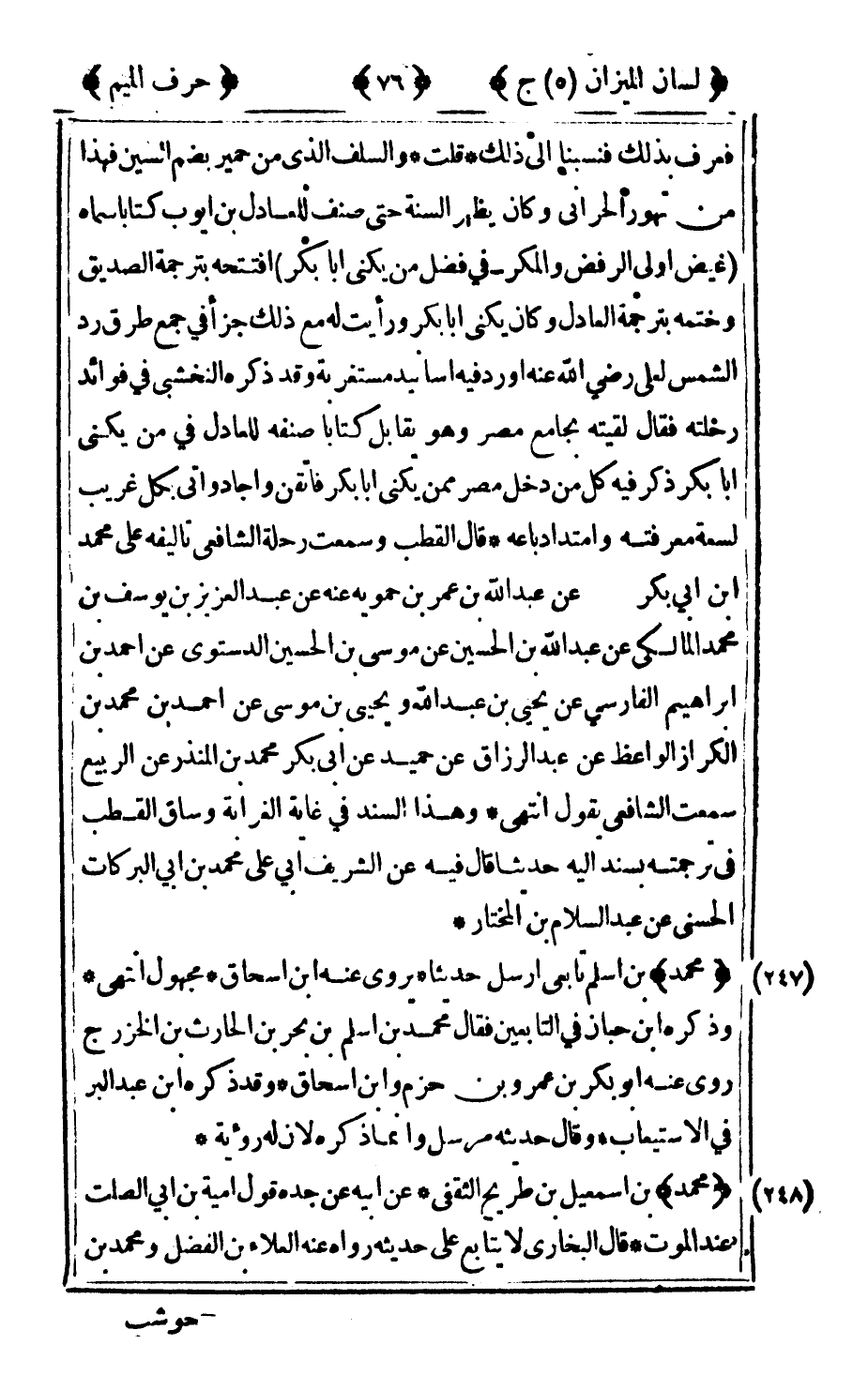 فعرف بذلك فنسبنا إلى ذلك قلت: والسلف الذي من حمير بضم السين فهذا من تهور الحراني وكان يظهر السنة حتى صنف للعادل بن أيوب كتابا سماه غيض أولى الرفض والمكر في فضل من يكنى أبا بكر افتتحه بترجمة الصديق وختمه بترجمة العادل وكان يكنى أبا بكر ورأيت له مع ذلك جزأ في جمع طرق رد الشمس لعلي رضى الله عنه أورد فيه أسانيد مستغربة وقد ذكره النخشبي في فوائد رحلته فقال: لقيته بجامع مصر وهو يقابل كتابا صنفه للعادل في من يكنى أبا بكر ذكر فيه كل من دخل مصر ممن يكنى أبا بكر فاتقن وأجاد واتى بكل غريب لسعة معرفته وامتداد باعه قال القطب وسمعت رحلة الشافعي تأليفه على محمد بن أبي بكر عن عبد الله بن عمر بن حمويه عنه عن عبد العزيز بن يوسف بن محمد المالكي عن عبد الله بن الحسين عن موسى بن الحسين الدستوري عن أحمد بن إبراهيم الفارسي عن يحيى بن عبد الله ويحيى بن موسى عن أحمد بن محمد بن الكراز الواعظ عن عبد الرزاق عن حميد عن أبي بكر محمد بن المنذر عن الربيع سمعت الشافعي يقول: انتهى وهذا السند في غاية الغرابة وساق القطب في ترجمته بسند إليه حديثا قال فيه عن الشريف أبي علي محمد بن أبي البركات الحسيني عن عبد السلام بن المختار.