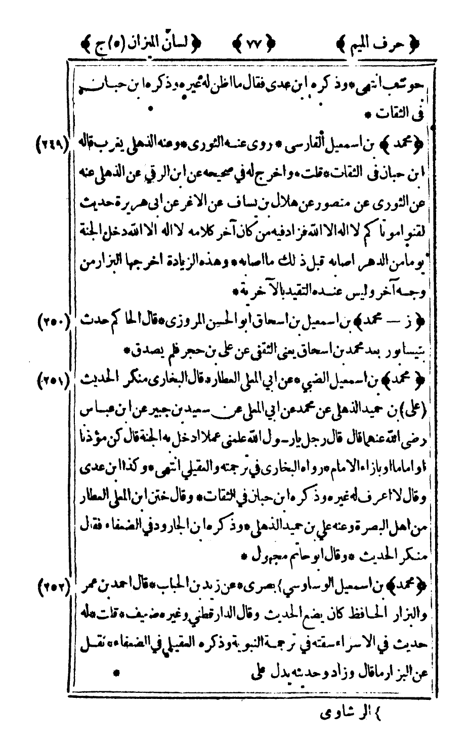 252 - "محمد" بن إسماعيل الوساوسي1 بصري عن زيد بن الحباب قال أحمد بن عمر والبزار الحافظ كان يضع الحديث وقال الدارقطني وغيره ضعيف قلت: له حديث في الإسراء سقته في ترجمة النبوية وذكره العقيلي في الضعفاء نقل عن البزار ما قال وزاد وحديثه يدل على.