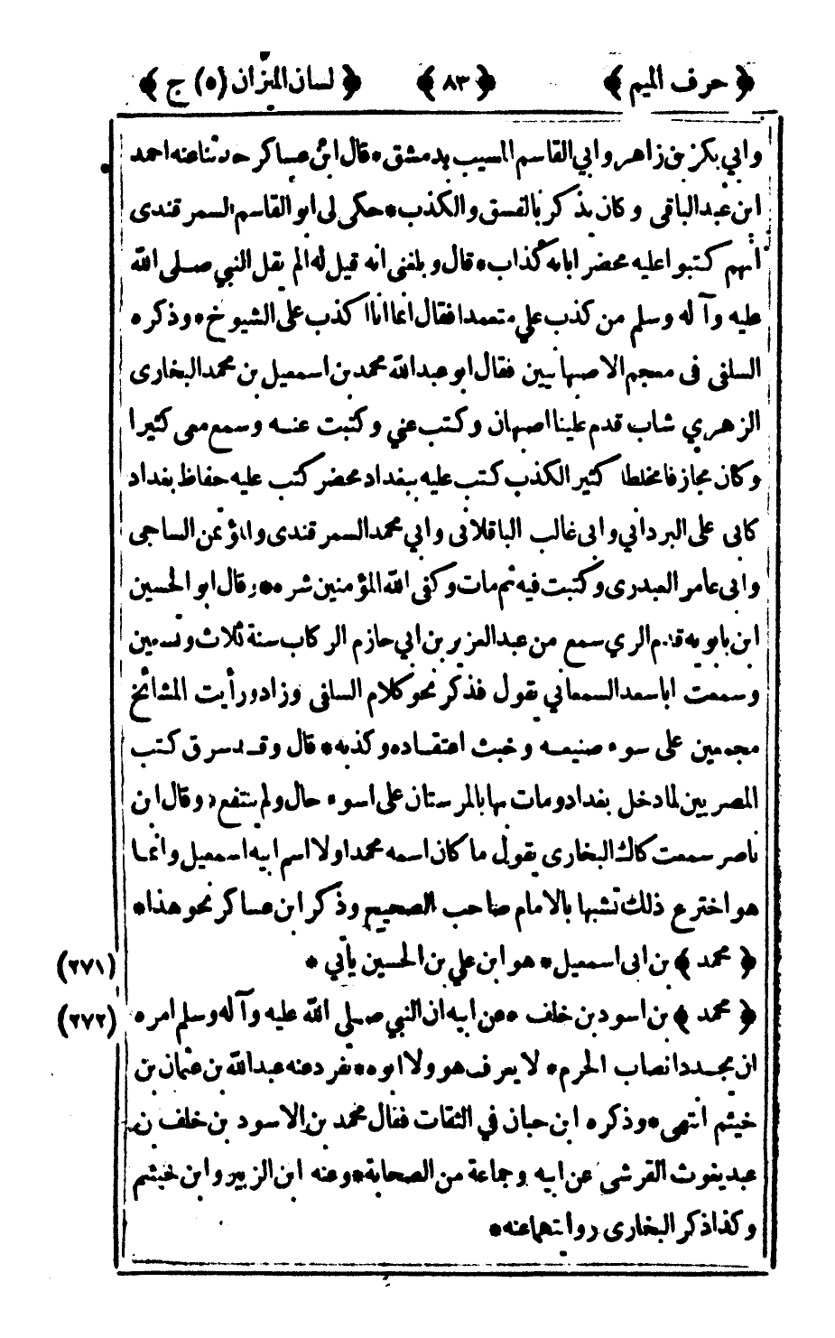 وأبي بكر بن زاهر وأبي القاسم المسيب بدمشق قال ابن عساكر حدثنا عنه أحمد بن عبد الباقي وكان يذكر بالفسق والكذب حكى لي أبو القاسم السمرقندي انهم كتبوا عليه محضرا بأنه كذاب قال وبلغني أنه قيل له الم يقل النبي صلى الله عليه وآله وسلم من كذب علي متعمدا فقال: إنما أنا أكذب على الشيوخ وذكره السلفي في معجم الأصبهانيين فقال أبو عبد الله محمد بن إسماعيل بن محمد البخاري الزهري: شاب قدم علينا أصبهان وكتب عني وكتبت عنه وسمع معي كثيرا وكان مجازفا مخلطا كثير الكذب كتب عليه ببغداد محضر كتب عليه حفاظ بغداد كأبي علي البرداني وأبي غالب الباقلاني وأبي محمد السمرقندي والمؤتمن الساجي وأبي عامر العبدري وكتبت فيه ثم مات وكفى الله المؤمنين شره وقال أبو الحسين الحسن بن بأبويه قدم الري سمع من عبد العزيز بن أبي حازم الركاب سنة ثلاث وتسعين وسمعت أبا سعد السمعاني يقول: فذكر نحو كلام السلفي وزاد ورأيت المشائخ مجمعين على سوء صنيعه وخبث اعتقاده وكذبه قال وقد سرق كتب المصريين لما دخل بغداد ومات بها بالمرستان على اسوء حال ولم ينتفع وقال ابن ناصر سمعت كاك البخاري يقول: ما كان اسمه محمدا ولا اسم أبيه إسماعيل وإنما هو اخترع ذلك تشبها بالإمام صاحب الصحيح وذكر بن عساكر نحو هذا.