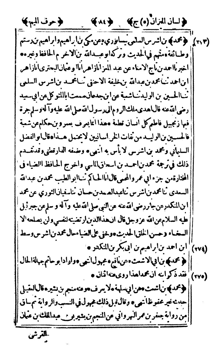 273 - "محمد" بن اشرس السلمي نيسابوري عن مكي بن إبراهيم وإبراهيم بن رستم وطائفة متهم في الحديث وتركه أبو عبد الله بن الأخرم الحافظ وغيره أخبرنا أحمد بن تاج الأمناء عن عبد المعز أنا زاهر أنا أبو عثمان البحتري أنا زاهر بن أحمد ثنا محمد بن عبد الله بن خليفة الأحنفي ثنا محمد بن اشرس السلمي ثنا الحسين بن الوليد ثنا شعبة عن ابن جدعان سمعت أبا المتوكل عن أبي سعيد رضى الله عنه قال أهدى ملك الروم إلى رسول الله صلى الله عليه وآله وسلم جرة فيها زنجبيل فاطعم كل انسان قطعة هذا إنما يعرف بعمرو بن حكام عن شعبة فالحسين بن الوليد من ثقات الخراسانيين لا يحتمل هذا قال أبو الفضل السليماني ومحمد بن اشرس لا بأس به انتهى وضعفه الدارقطني وقد تقدم ذلك في ترجمة محمد بن أحمد بن إسحاق الماسي واخرج الحافظ الضياء في المختارة من جزء أبي عمرو المحمي قال أنا الحاكم ثنا أبو الطيب محمد بن عبد الله السعدي ثنا محمد بن اشرس ثنا عبد الصمد بن حسان ثنا سفيان الثوري عن محمد بن المنكدر عن جابر رضى الله عنه عن النبي صلى الله عليه وآله وسلم عن جبرائيل عليه السلام عن الله عز وجل قال إن هذا الدين ارتضيته لنفسي ولن يصلحه إلا السخاء وحسن الخلق الحديث وخفي على الضياء حال محمد بن اشرس وسط بن أحمد بن إبراهيم بن أبي بكر بن المنكدر.