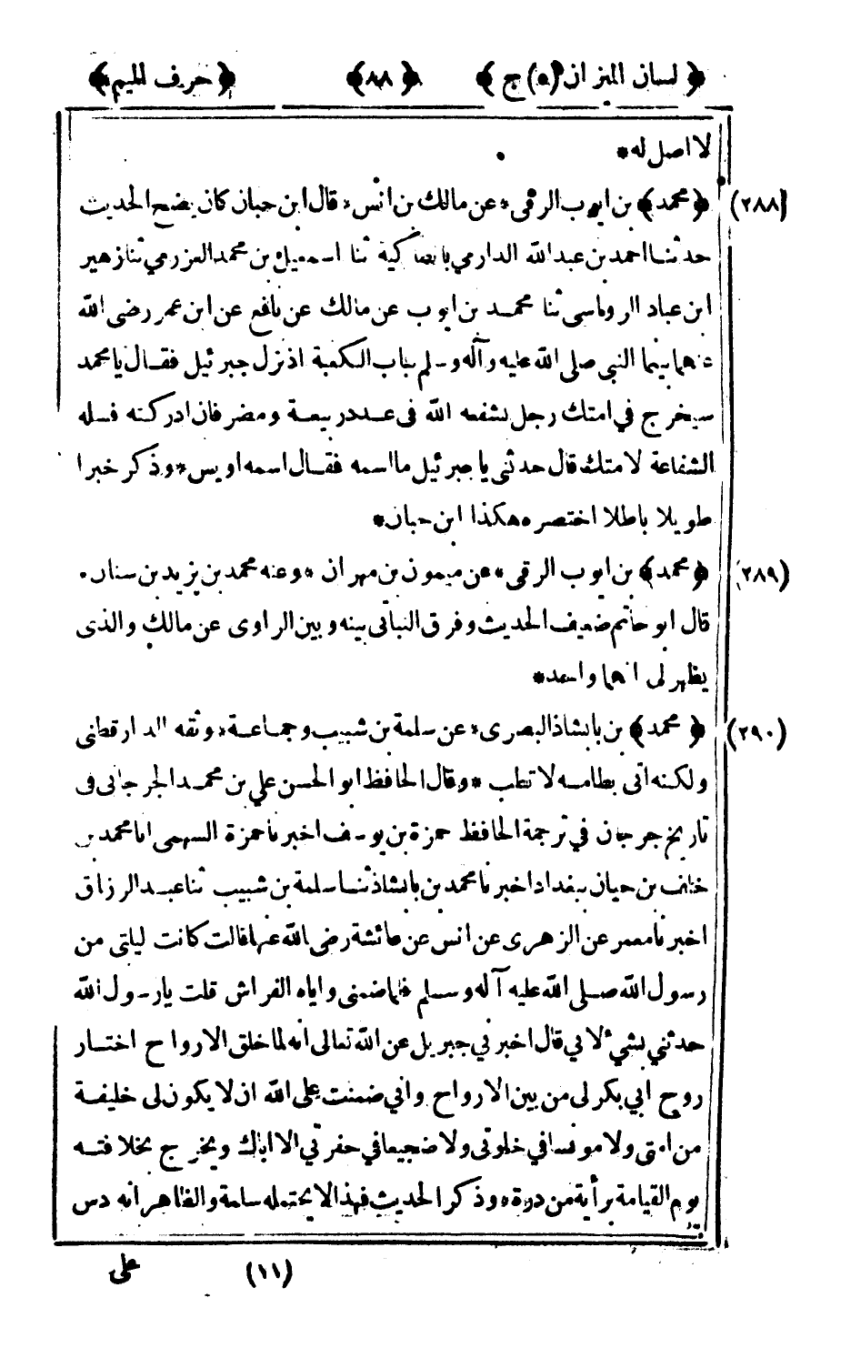 288 - "محمد" بن أيوب الرقي عن مالك بن أنس قال ابن حبان كان يضع الحديث حدثنا أحمد بن عبد الله الدارمي بأنطاكية ثنا إسماعيل بن محمد العزرمي ثنا زهير بن عباد الرواسي ثنا محمد بن أيوب عن مالك عن نافع عن ابن عمر رضى الله عنهما بينما النبي صلى الله عليه وآله وسلم بباب الكعبة إذ نزل جبرائيل فقال: يا محمد سيخرج في أمتك رجل يشفعه الله في عدد ربيعة ومضر فإن أدركته فسله الشفاعة لأمتك قال حدثني يا جبرائيل ما اسمه فقال: اسمه أويس وذكر خبرا طويلا باطلا اختصره هكذا بن حبان.