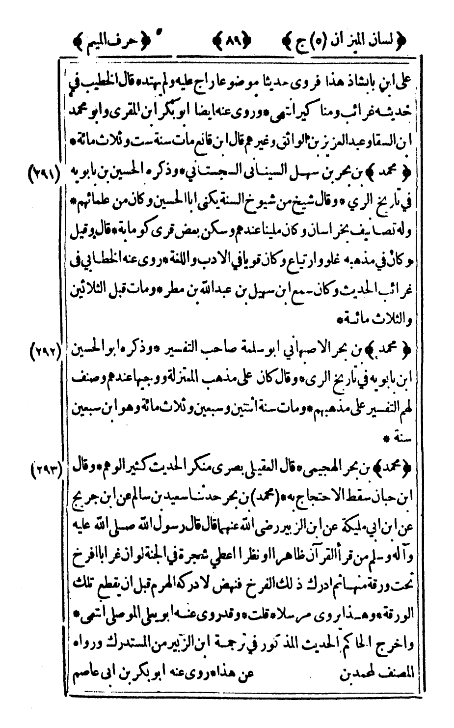 292 - "محمد" بن بحر الأصبهاني أبو سلمة صاحب التفسير وذكره أبو الحسين بن بأبويه في تاريخ الري وقال كان على مذهب المعتزلة ووجيها عندهم وصنف لهم التفسير على مذهبهم ومات سنة اثنتين وسبعين وثلاث مائة وهو ابن سبعين سنة.
