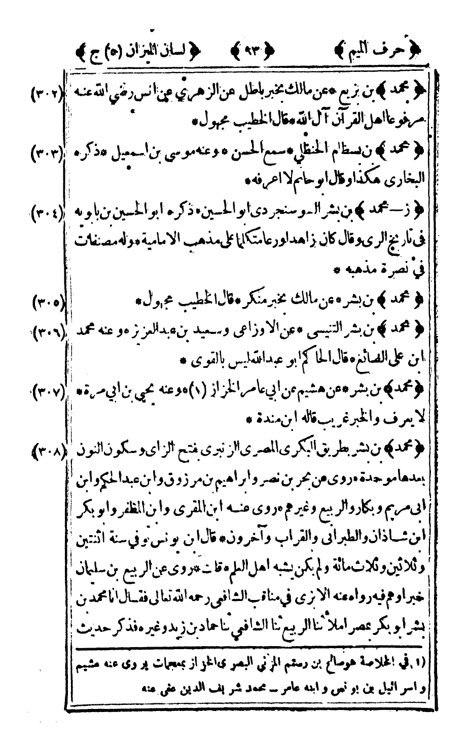 306 - "محمد" بن بشر التنيسي عن الأوزاعي وسعيد بن عبد العزيز وعنه محمد بن علي الصائغ قال الحاكم أبو عبد الله ليس بالقوي.