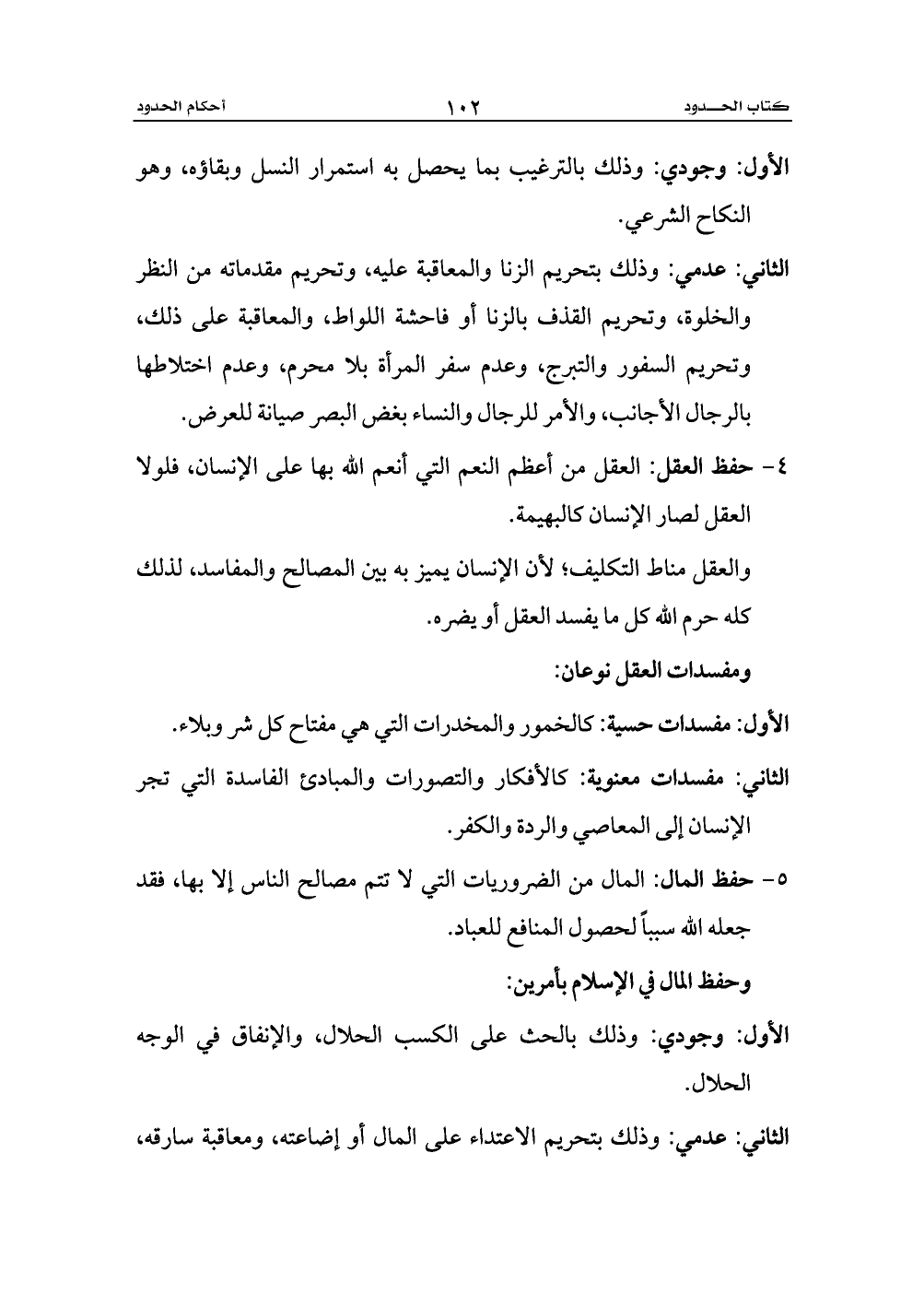 الثاني: عدمي: وذلك بتحريم الزنا والمعاقبة عليه، وتحريم مقدماته من النظر والخلوة، وتحريم القذف بالزنا أو فاحشة اللواط، والمعاقبة على ذلك، وتحريم السفور والتبرج، وعدم سفر المرأة بلا محرم، وعدم اختلاطها بالرجال الأجانب، والأمر للرجال والنساء بغض البصر صيانة للعرض.