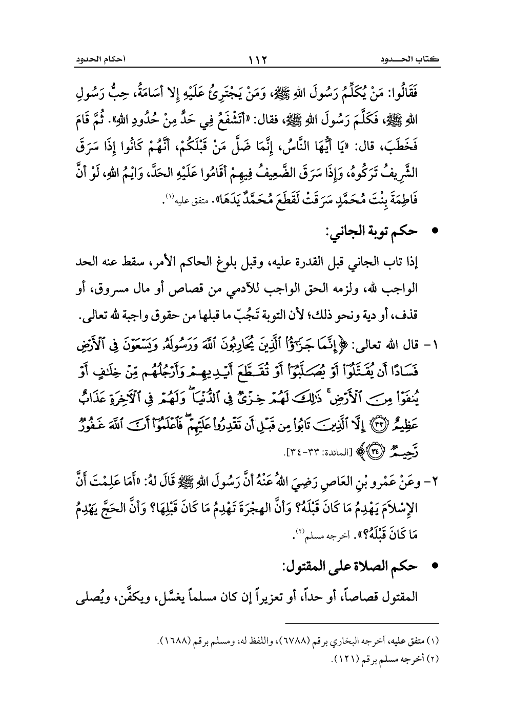 1 - قال الله تعالى: {إِنَّمَا جَزَاءُ الَّذِينَ يُحَارِبُونَ اللَّهَ وَرَسُولَهُ وَيَسْعَوْنَ فِي الْأَرْضِ فَسَادًا أَنْ يُقَتَّلُوا أَوْ يُصَلَّبُوا أَوْ تُقَطَّعَ أَيْدِيهِمْ وَأَرْجُلُهُمْ مِنْ خِلَافٍ أَوْ يُنْفَوْا مِنَ الْأَرْضِ ذَلِكَ لَهُمْ خِزْيٌ فِي الدُّنْيَا وَلَهُمْ فِي الْآخِرَةِ عَذَابٌ عَظِيمٌ (33) إِلَّا الَّذِينَ تَابُوا مِنْ قَبْلِ أَنْ تَقْدِرُوا عَلَيْهِمْ فَاعْلَمُوا أَنَّ اللَّهَ غَفُورٌ رَحِيمٌ (34)} ... [المائدة: 33 - 34].