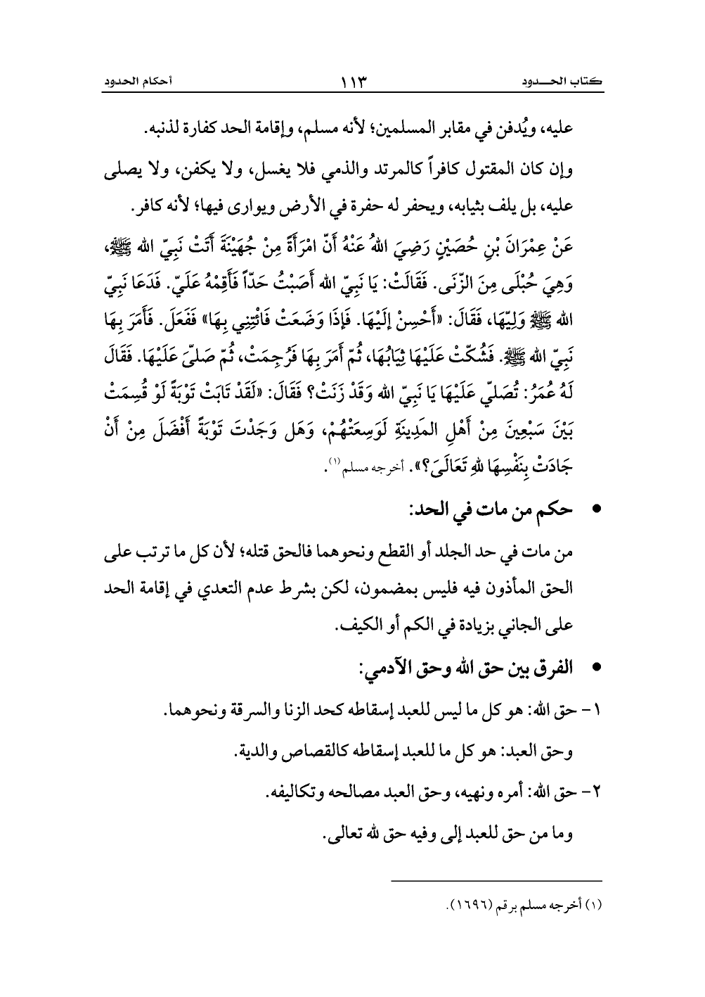 عَنْ عِمْرَانَ بْنِ حُصَيْنٍ رَضِيَ اللهُ عَنْهُ أَنّ امْرَأَةً مِنْ جُهَيْنَةَ أَتَتْ نَبِيّ الله - صلى الله عليه وسلم -، وَهِيَ حُبْلَى مِنَ الزّنَى. فَقَالَتْ: يَا نَبِيّ الله أَصَبْتُ حَدّاً فَأَقِمْهُ عَلَيّ. فَدَعَا نَبِيّ الله - صلى الله عليه وسلم - وَلِيّهَا، فَقَالَ: «أَحْسِنْ إلَيْهَا. فَإذَا وَضَعَتْ فَائْتِنِي بِهَا» فَفَعَلَ. فَأَمَرَ بِهَا نَبِيّ الله - صلى الله عليه وسلم -. فَشُكّتْ عَلَيْهَا ثِيَابُهَا، ثُمّ أَمَرَ بِهَا فَرُجِمَتْ، ثُمّ صَلّىَ عَلَيْهَا. فَقَالَ لَهُ عُمَرُ: تُصَلّي عَلَيْهَا يَا نَبِيّ الله وَقَدْ زَنَتْ؟ فَقَالَ: «لَقَدْ تَابَتْ تَوْبَةً لَوْ قُسِمَتْ بَيْنَ سَبْعِينَ مِنْ أَهْلِ المَدِينَةِ لَوَسِعَتْهُمْ، وَهَل وَجَدْتَ تَوْبَةً أَفْضَلَ مِنْ أَنْ جَادَتْ بِنَفْسِهَا للهِ تَعَالَىَ؟». أخرجه مسلم (¬1).