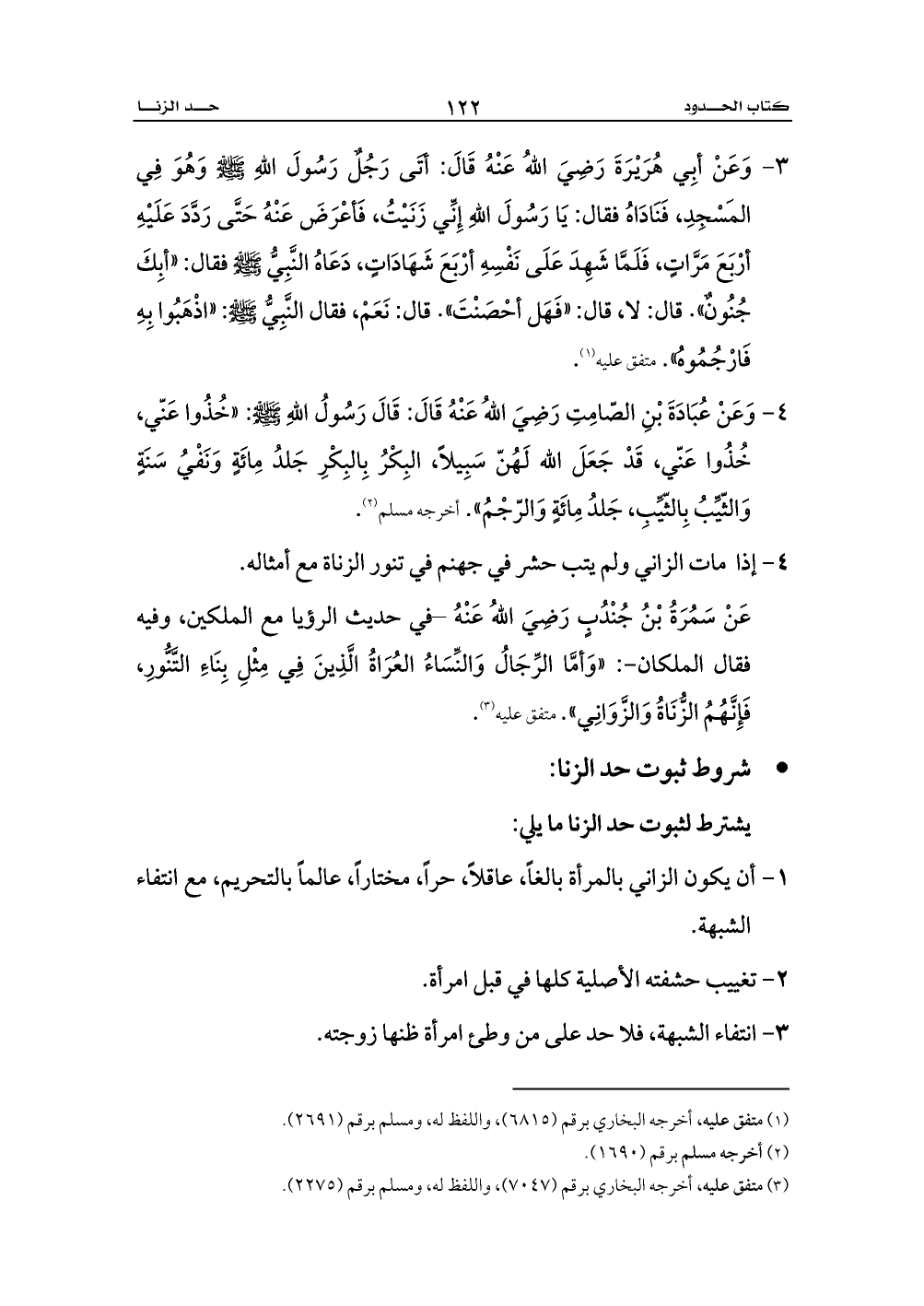 3 - وَعَنْ أبِي هُرَيْرَةَ رَضِيَ اللهُ عَنْهُ قَالَ: أتَى رَجُلٌ رَسُولَ اللهِ - صلى الله عليه وسلم - وَهُوَ فِي المَسْجِدِ، فَنَادَاهُ فقال: يَا رَسُولَ اللهِ إِنِّي زَنَيْتُ، فَأعْرَضَ عَنْهُ حَتَّى رَدَّدَ عَلَيْهِ أرْبَعَ مَرَّاتٍ، فَلَمَّا شَهِدَ عَلَى نَفْسِهِ أرْبَعَ شَهَادَاتٍ، دَعَاهُ النَّبِيُّ - صلى الله عليه وسلم - فقال: «أبِكَ جُنُونٌ». قال: لا، قال: «فَهَل أحْصَنْتَ». قال: نَعَمْ، فقال النَّبِيُّ - صلى الله عليه وسلم -: «اذْهَبُوا بِهِ فَارْجُمُوهُ». متفق عليه (¬1).