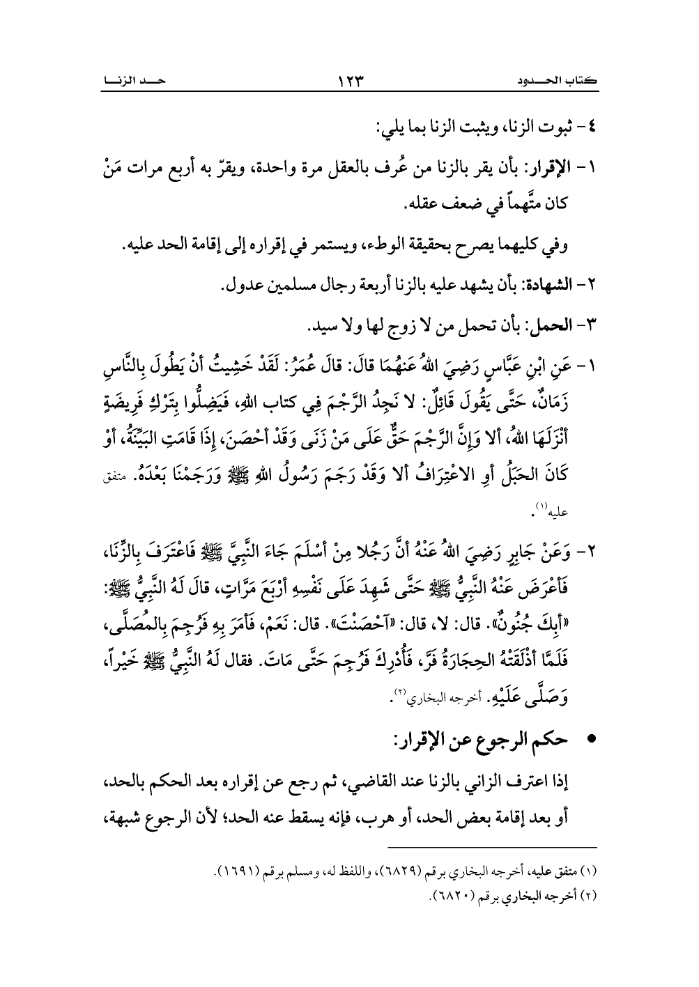 1 - عَنِ ابْنِ عَبَّاسٍ رَضِيَ اللهُ عَنهُمَا قالَ: قالَ عُمَرُ: لَقَدْ خَشِيتُ أنْ يَطُولَ بِالنَّاسِ زَمَانٌ، حَتَّى يَقُولَ قَائِلٌ: لا نَجِدُ الرَّجْمَ فِي كتاب اللهِ، فَيَضِلُّوا بِتَرْكِ فَرِيضَةٍ أنْزَلَهَا اللهُ، ألا وَإِنَّ الرَّجْمَ حَقٌّ عَلَى مَنْ زَنَى وَقَدْ أحْصَنَ، إِذَا قَامَتِ البَيِّنَةُ، أوْ كَانَ الحَبَلُ أوِ الاعْتِرَافُ ألا وَقَدْ رَجَمَ رَسُولُ اللهِ - صلى الله عليه وسلم - وَرَجَمْنَا بَعْدَهُ. متفق عليه (¬1).