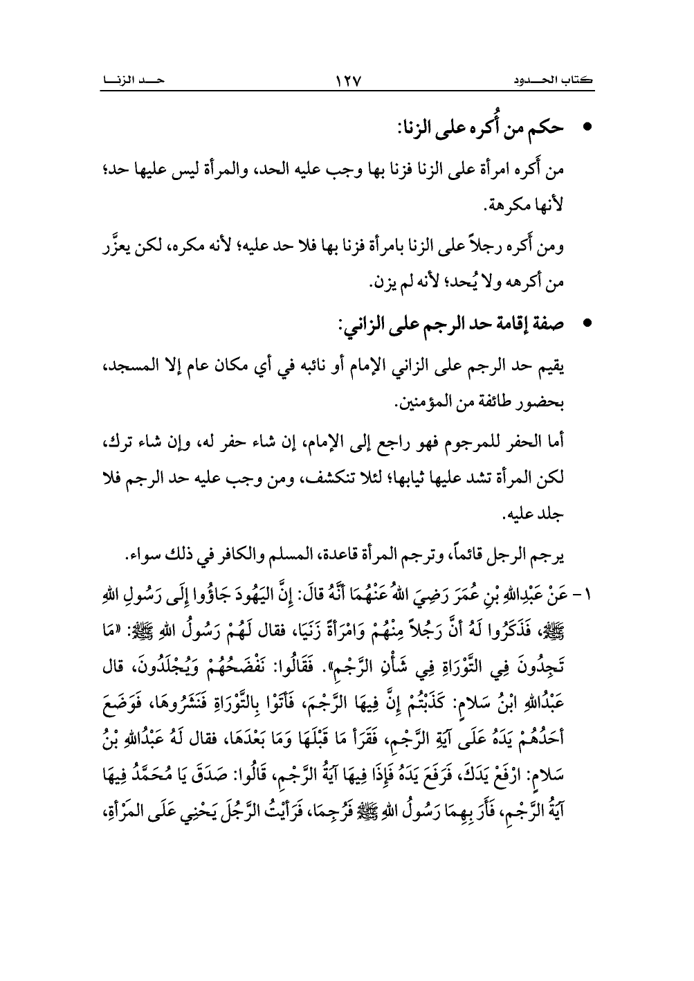 1 - عَنْ عَبْدِاللهِ بْنِ عُمَرَ رَضِيَ اللهُ عَنْهُمَا أنَّهُ قالَ: إِنَّ اليَهُودَ جَاؤُوا إِلَى رَسُولِ اللهِ - صلى الله عليه وسلم -، فَذَكَرُوا لَهُ أنَّ رَجُلاً مِنْهُمْ وَامْرَأةً زَنَيَا، فقال لَهُمْ رَسُولُ اللهِ - صلى الله عليه وسلم -: «مَا تَجِدُونَ فِي التَّوْرَاةِ فِي شَأْنِ الرَّجْمِ». فَقَالُوا: نَفْضَحُهُمْ وَيُجْلَدُونَ، قال عَبْدُاللهِ ابْنُ سَلامٍ: كَذَبْتُمْ إِنَّ فِيهَا الرَّجْمَ، فَأتَوْا بِالتَّوْرَاةِ فَنَشَرُوهَا، فَوَضَعَ أحَدُهُمْ يَدَهُ عَلَى آيَةِ الرَّجْمِ، فَقَرَأ مَا قَبْلَهَا وَمَا بَعْدَهَا، فقال لَهُ عَبْدُاللهِ بْنُ سَلامٍ: ارْفَعْ يَدَكَ، فَرَفَعَ يَدَهُ فَإِذَا فِيهَا آيَةُ الرَّجْمِ، قَالُوا: صَدَقَ يَا مُحَمَّدُ فِيهَا