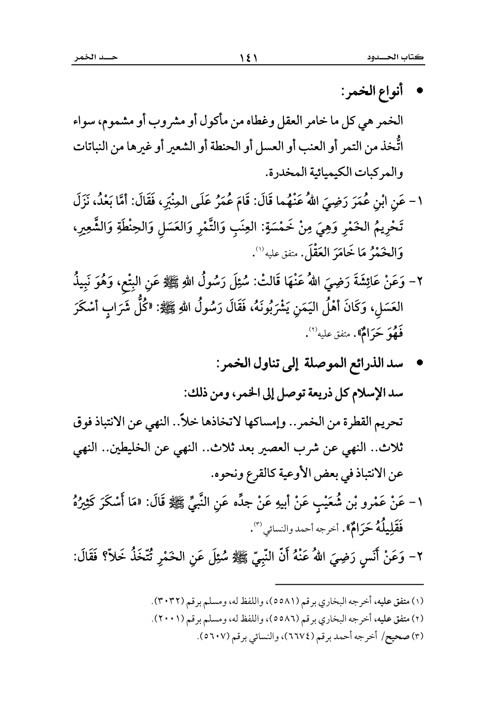 1 - عَنِ ابْنِ عُمَرَ رَضِيَ اللهُ عَنْهُما قَالَ: قَامَ عُمَرُ عَلَى المِنْبَرِ، فَقَالَ: أمَّا بَعْدُ، نَزَلَ تَحْرِيمُ الخَمْرِ وَهِيَ مِنْ خَمْسَةٍ: العِنَبِ وَالتَّمْرِ وَالعَسَلِ وَالحِنْطَةِ وَالشَّعِيرِ، وَالخَمْرُ مَا خَامَرَ العَقْلَ. متفق عليه (¬1).
