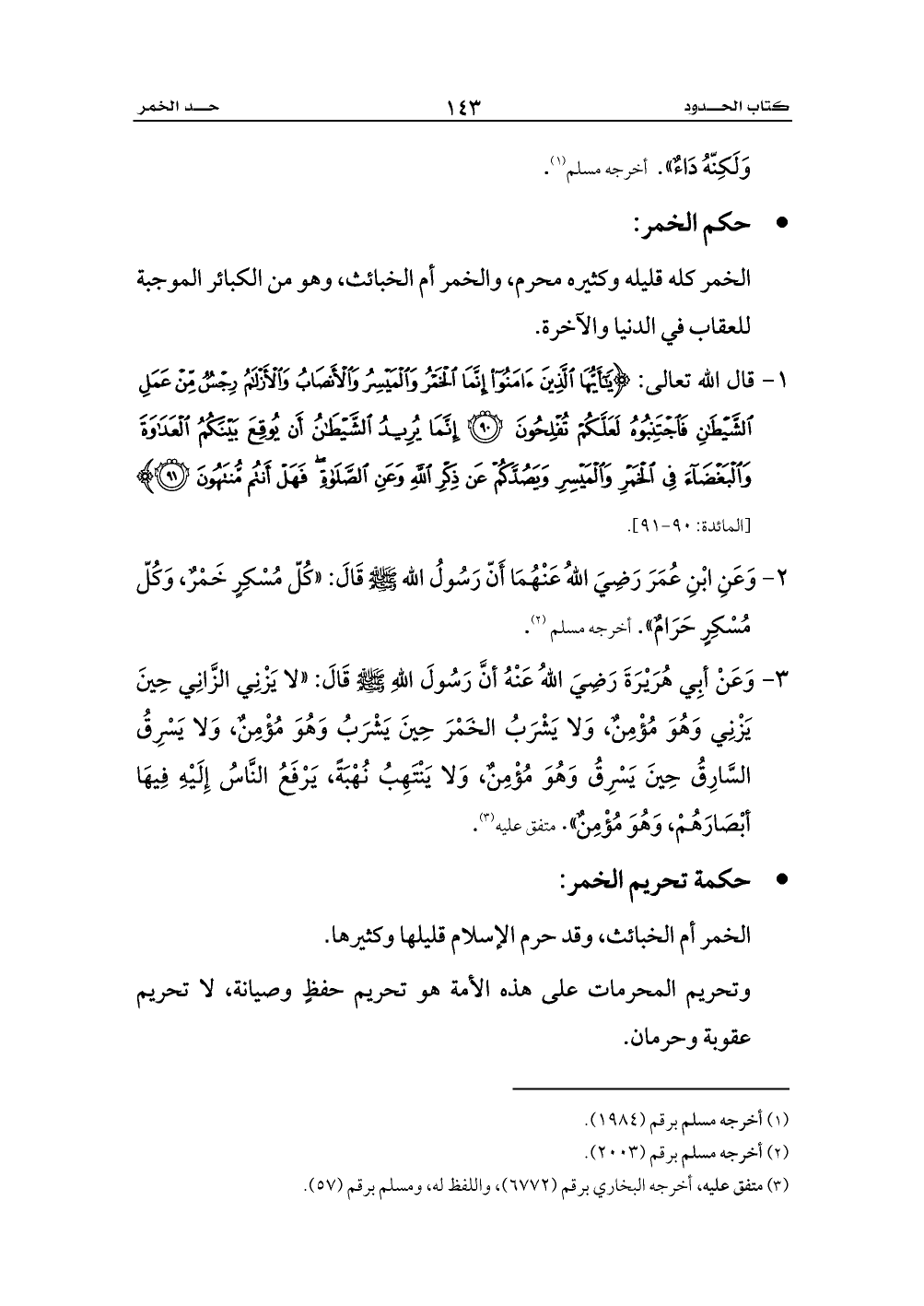 1 - قال الله تعالى: {يَاأَيُّهَا الَّذِينَ آمَنُوا إِنَّمَا الْخَمْرُ وَالْمَيْسِرُ وَالْأَنْصَابُ وَالْأَزْلَامُ رِجْسٌ مِنْ عَمَلِ الشَّيْطَانِ فَاجْتَنِبُوهُ لَعَلَّكُمْ تُفْلِحُونَ (90) إِنَّمَا يُرِيدُ الشَّيْطَانُ أَنْ يُوقِعَ بَيْنَكُمُ الْعَدَاوَةَ وَالْبَغْضَاءَ فِي الْخَمْرِ وَالْمَيْسِرِ وَيَصُدَّكُمْ عَنْ ذِكْرِ اللَّهِ وَعَنِ الصَّلَاةِ فَهَلْ أَنْتُمْ مُنْتَهُونَ (91)} ... [المائدة: 90 - 91].