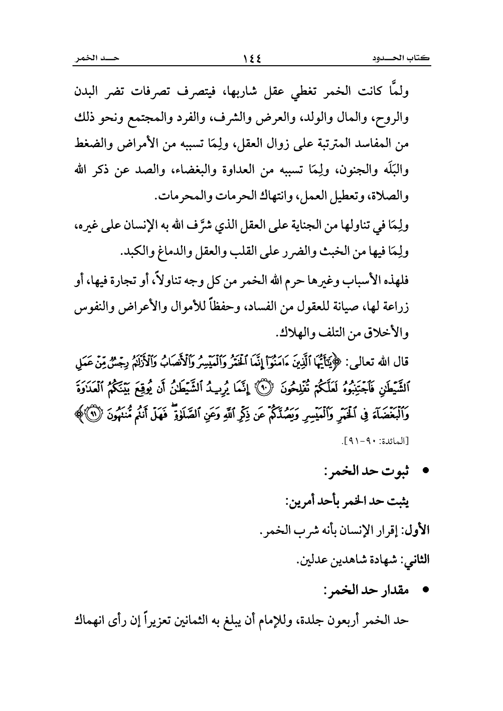 ولمَّا كانت الخمر تغطي عقل شاربها، فيتصرف تصرفات تضر البدن والروح، والمال والولد، والعرض والشرف، والفرد والمجتمع ونحو ذلك من المفاسد المترتبة على زوال العقل، ولِمَا تسببه من الأمراض والضغط والبَلَه والجنون، ولِمَا تسببه من العداوة والبغضاء، والصد عن ذكر الله والصلاة، وتعطيل العمل، وانتهاك الحرمات والمحرمات.