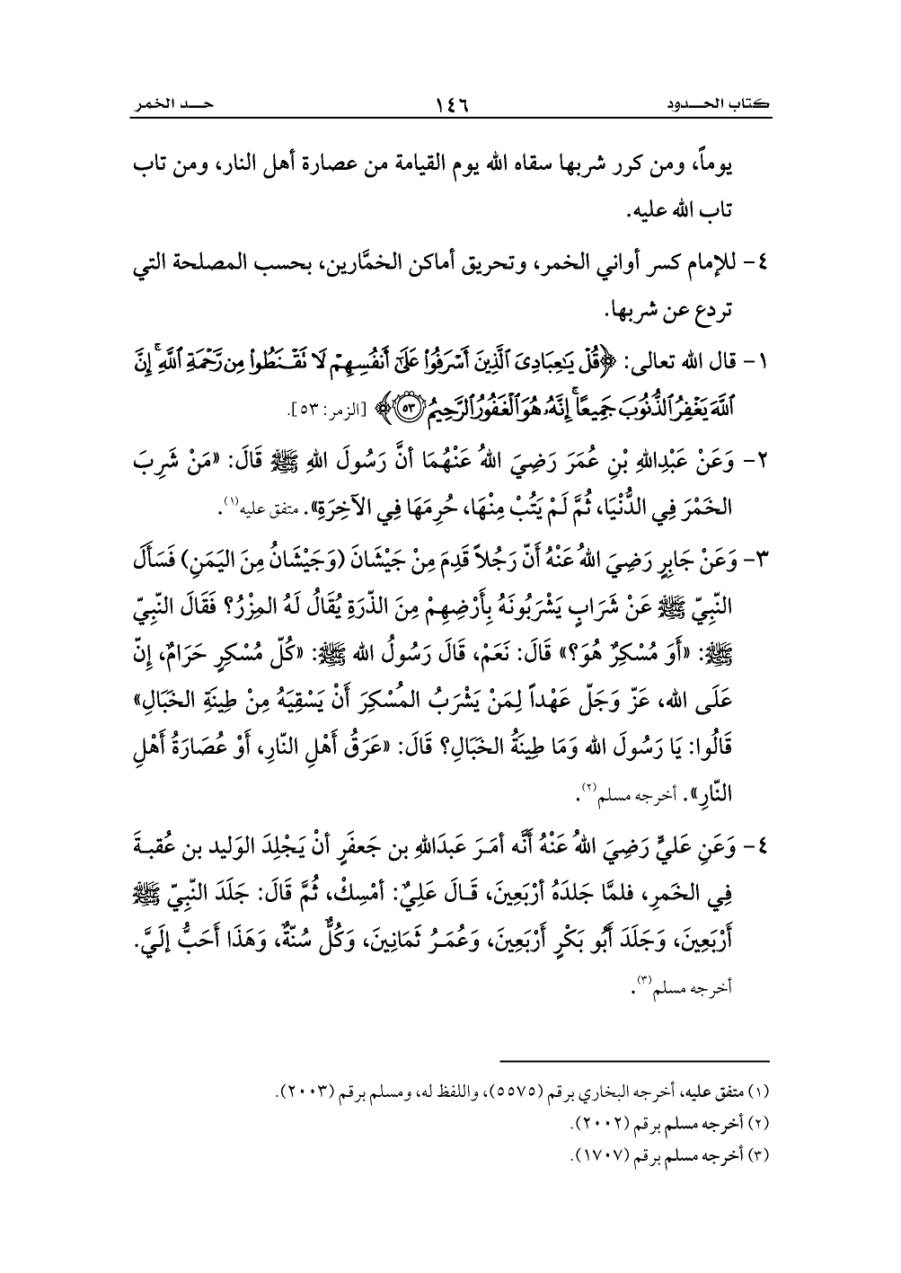 3 - وَعَنْ جَابِرٍ رَضِيَ اللهُ عَنْهُ أَنّ رَجُلاً قَدِمَ مِنْ جَيْشَانَ (وَجَيْشَانُ مِنَ اليَمَنِ) فَسَأَلَ النّبِيّ - صلى الله عليه وسلم - عَنْ شَرَابٍ يَشْرَبُونَهُ بِأَرْضِهِمْ مِنَ الذّرَةِ يُقَالُ لَهُ المِزْرُ؟ فَقَالَ النّبِيّ - صلى الله عليه وسلم -: «أَوَ مُسْكِرٌ هُوَ؟» قَالَ: نَعَمْ، قَالَ رَسُولُ الله - صلى الله عليه وسلم -: «كُلّ مُسْكِرٍ حَرَامٌ، إِنّ عَلَى الله، عَزّ وَجَلّ عَهْداً لِمَنْ يَشْرَبُ المُسْكِرَ أَنْ يَسْقِيَهُ مِنْ طِينَةِ الخَبَالِ» قَالُوا: يَا رَسُولَ الله وَمَا طِينَةُ الخَبَالِ؟ قَالَ: «عَرَقُ أَهْلِ النّارِ، أَوْ عُصَارَةُ أَهْلِ النّارِ». أخرجه مسلم (¬2).