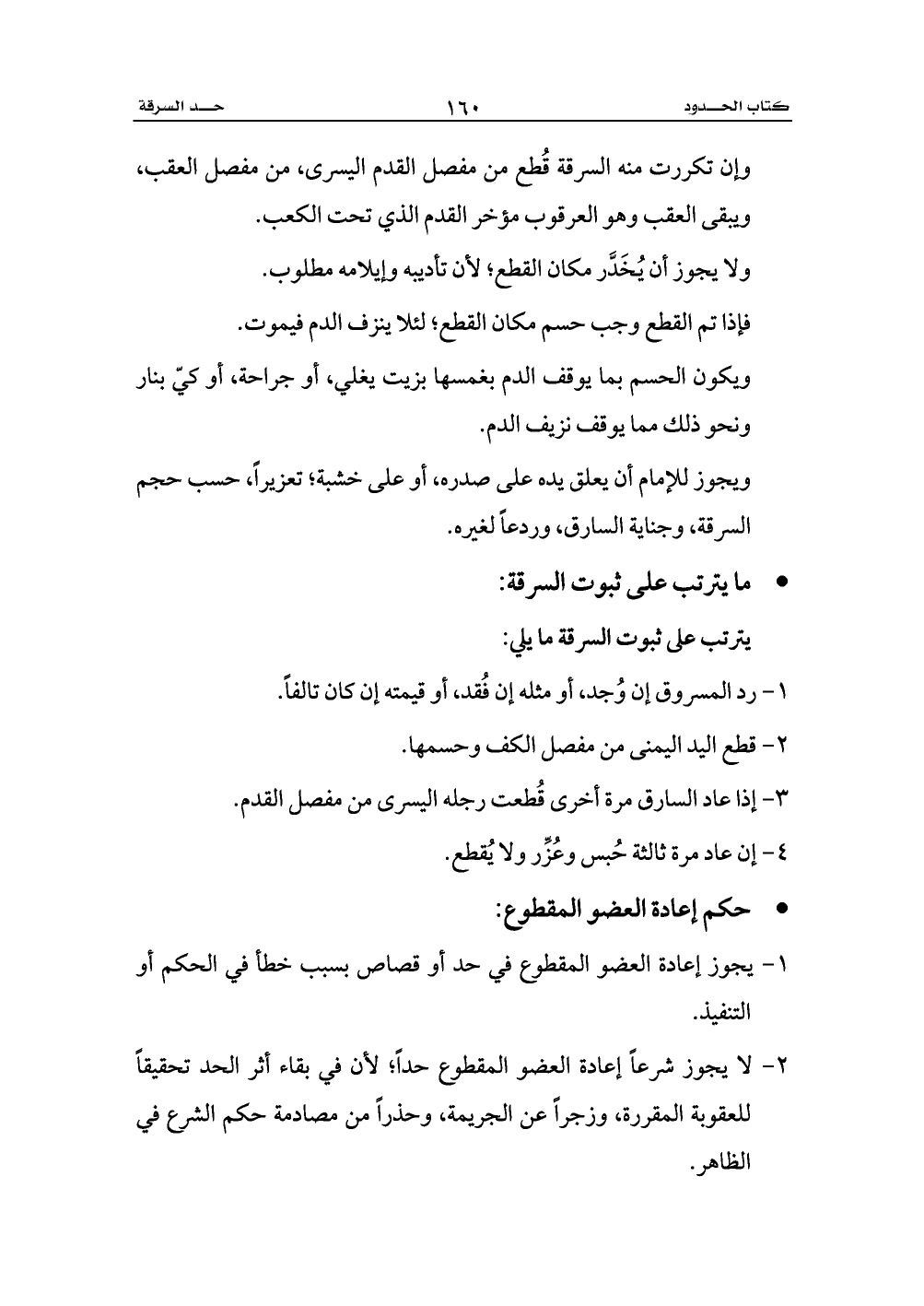 وإن تكررت منه السرقة قُطع من مفصل القدم اليسرى، من مفصل العقب، ويبقى العقب وهو العرقوب مؤخر القدم الذي تحت الكعب.