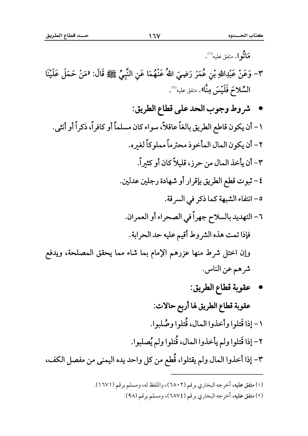 3 - وَعَنْ عَبْدِاللهِ بْنِ عُمَرَ رَضِيَ اللهُ عَنْهُمَا عَنِ النَّبِيِّ - صلى الله عليه وسلم - قَالَ: «مَنْ حَمَلَ عَلَيْنَا السِّلاحَ فَلَيْسَ مِنَّا». متفق عليه (¬2).